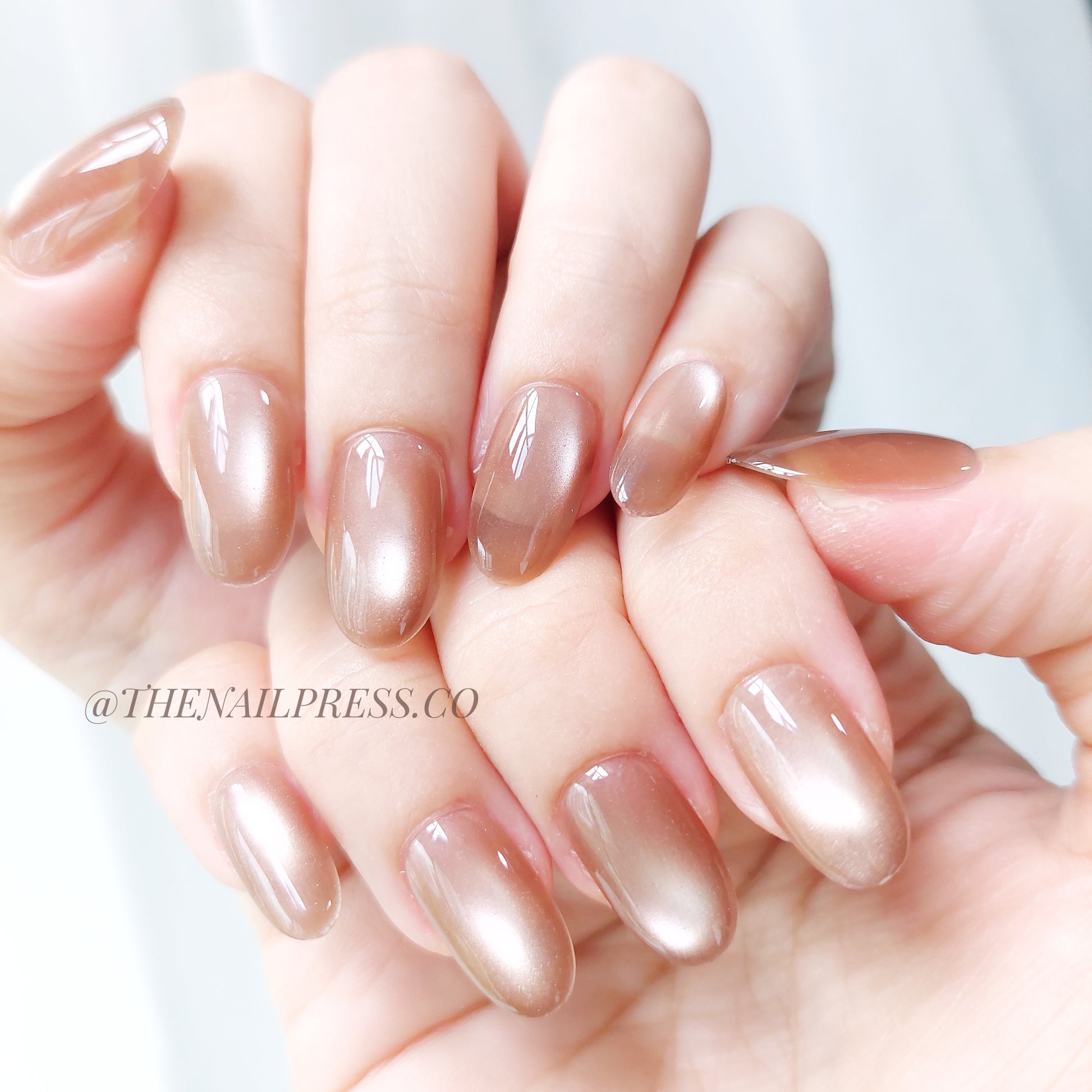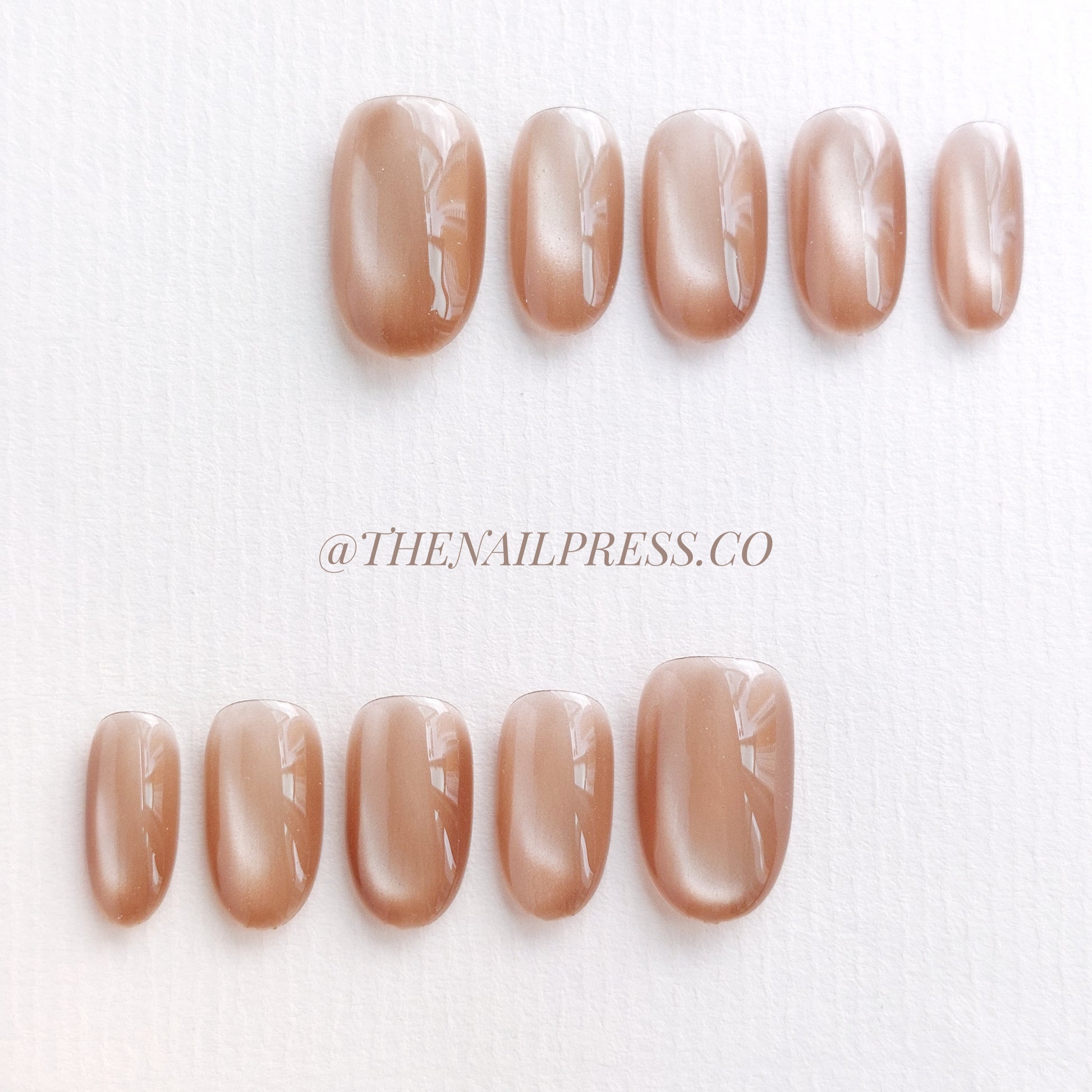 Indulge in the rich warmth of Maple Glaze Cat-Eye. The mesmerising amber hue is enhanced by a glowing cat-eye effect, creating an elegant, autumn-inspired look with depth and radiance. Medium oval rounded shape provides a flattering, sophisticated silhouette. Handmade, reusable, and salon-quality for effortlessly beautiful nails.