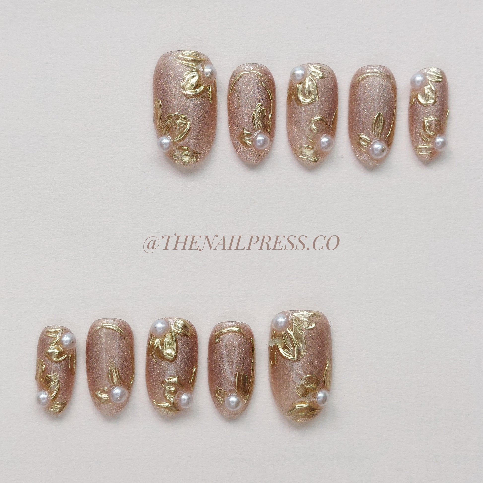 Elevate your nails with delicate metallic gold florals and lustrous pearls set on a mesmerising cat-eye base. The medium oval rounded shape enhances the refined, polished look, perfect for lovers of sophisticated elegance. These handmade press-on nails provide a salon-quality finish with effortless application.