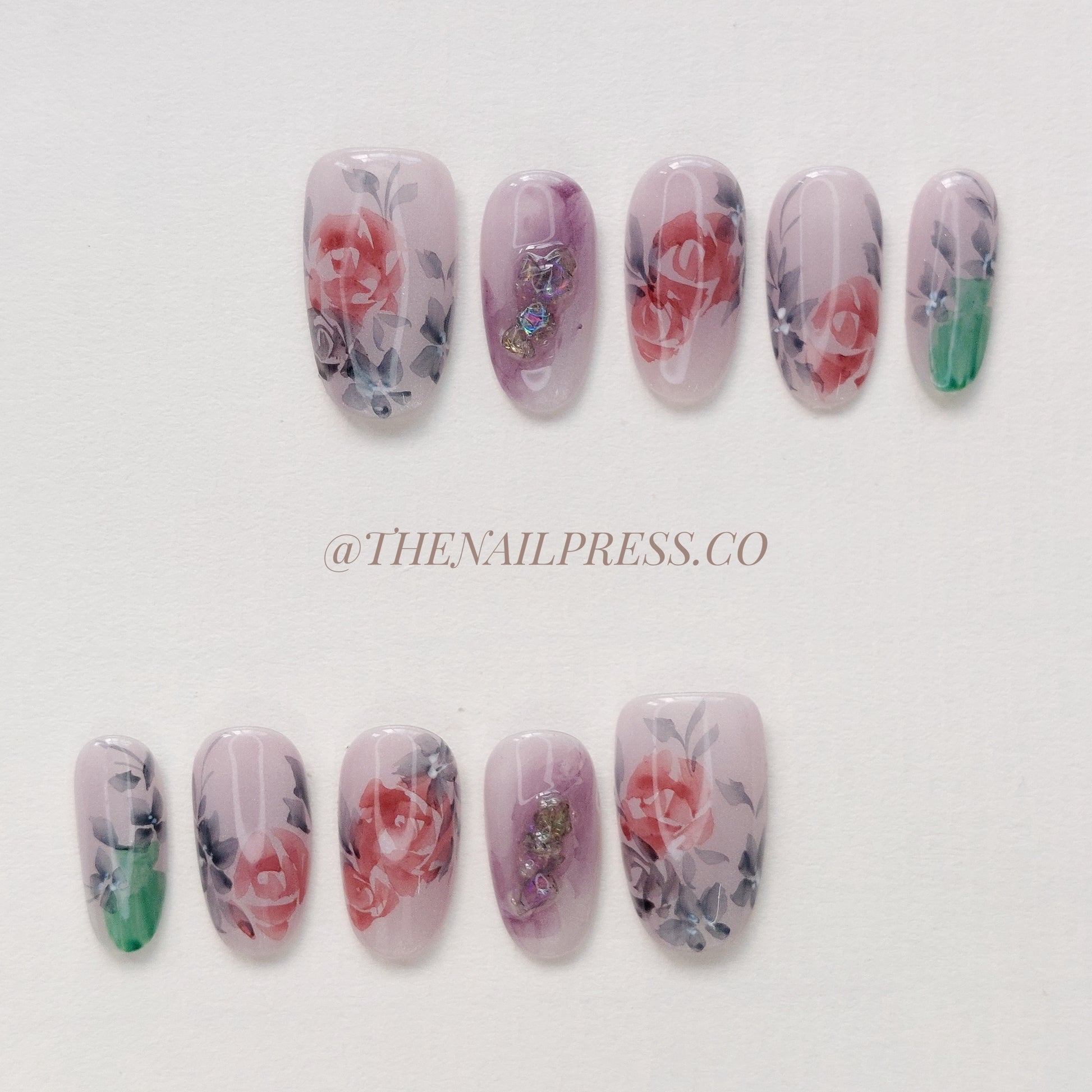 Soft, watercolour roses create a dreamy, romantic look in Mist of Roses. The medium oval rounded shape enhances its graceful silhouette, perfect for everyday elegance or special occasions. These handmade press-on nails are reusable and offer a salon-quality finish for effortless beauty.
