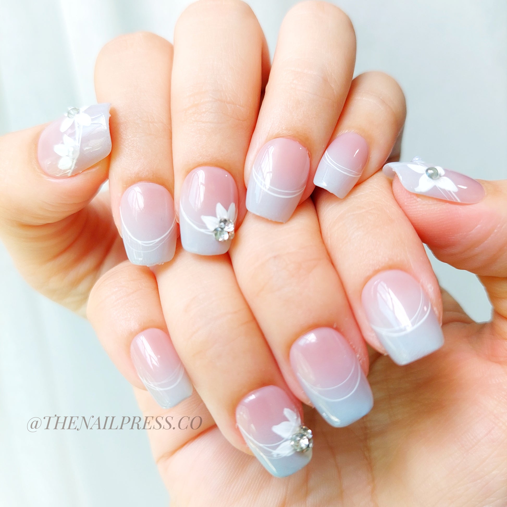 Indulge in the delicate beauty of Misty Blooms. Soft grey gradients are enhanced by intricate white flowers, evoking grace and charm. Short ballerina shape offers a sleek, flattering silhouette. Handmade, reusable, and salon-quality for nails that are effortlessly elegant and comfortable all day.