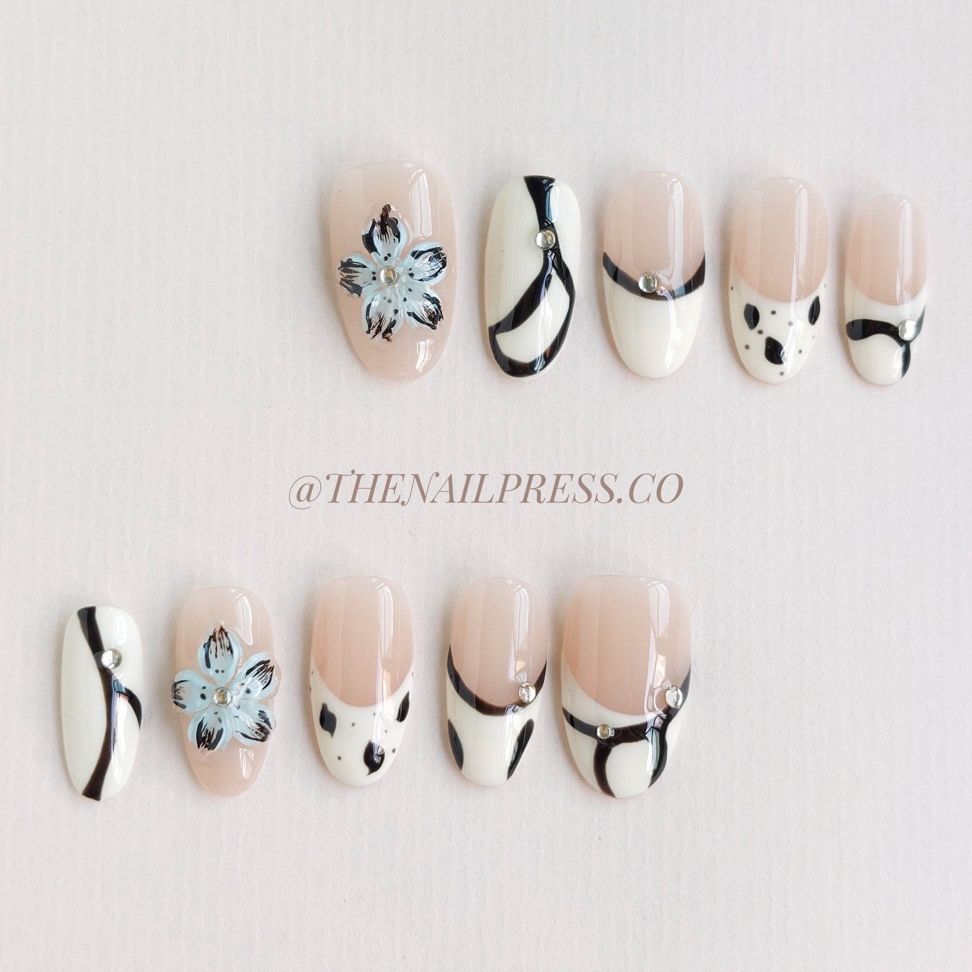 Add intrigue to your nails with Monochrome Floral Mystique, where sculpted flowers meet striking black-and-white contrast for a modern yet timeless look. The short oval shape enhances its chic elegance, making it perfect for any occasion. These handmade press-on nails are crafted for effortless wear, delivering a polished, salon-quality finish every time.