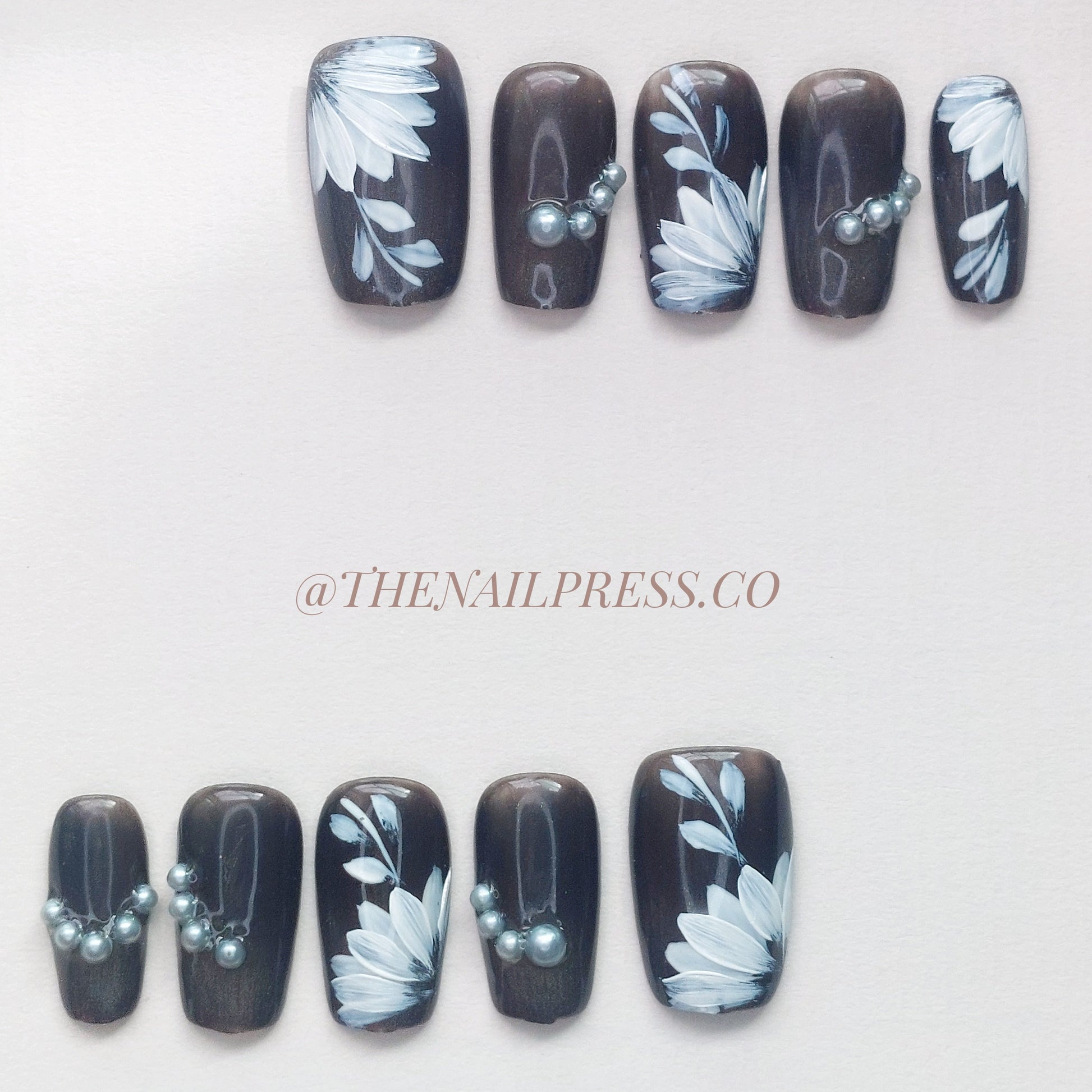 A deep black base adorned with delicate white florals brings Monochrome Grace to life, exuding timeless elegance and sophistication. Soft pearl accents add a touch of luxury, balancing bold and graceful elements. The medium square shape enhances this chic, monochrome aesthetic. These handmade press-on nails offer a salon-quality finish for effortlessly beautiful nails.
