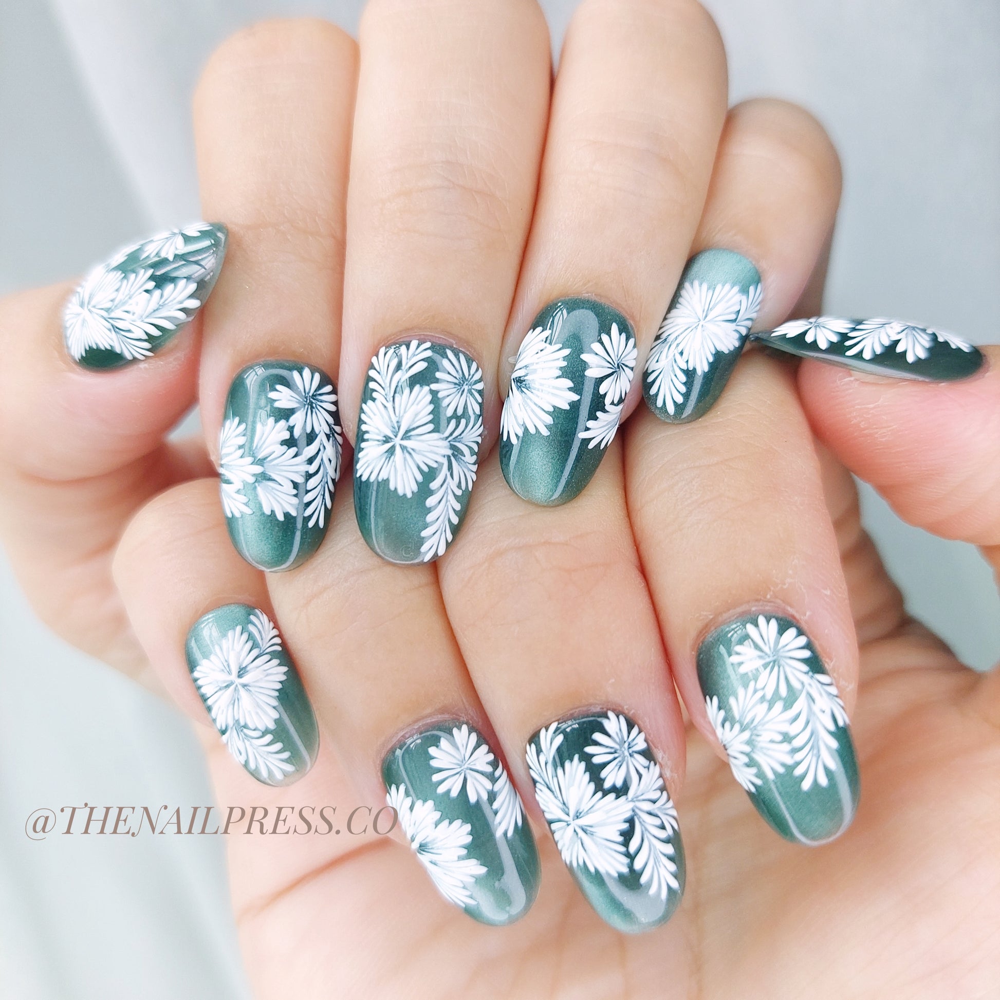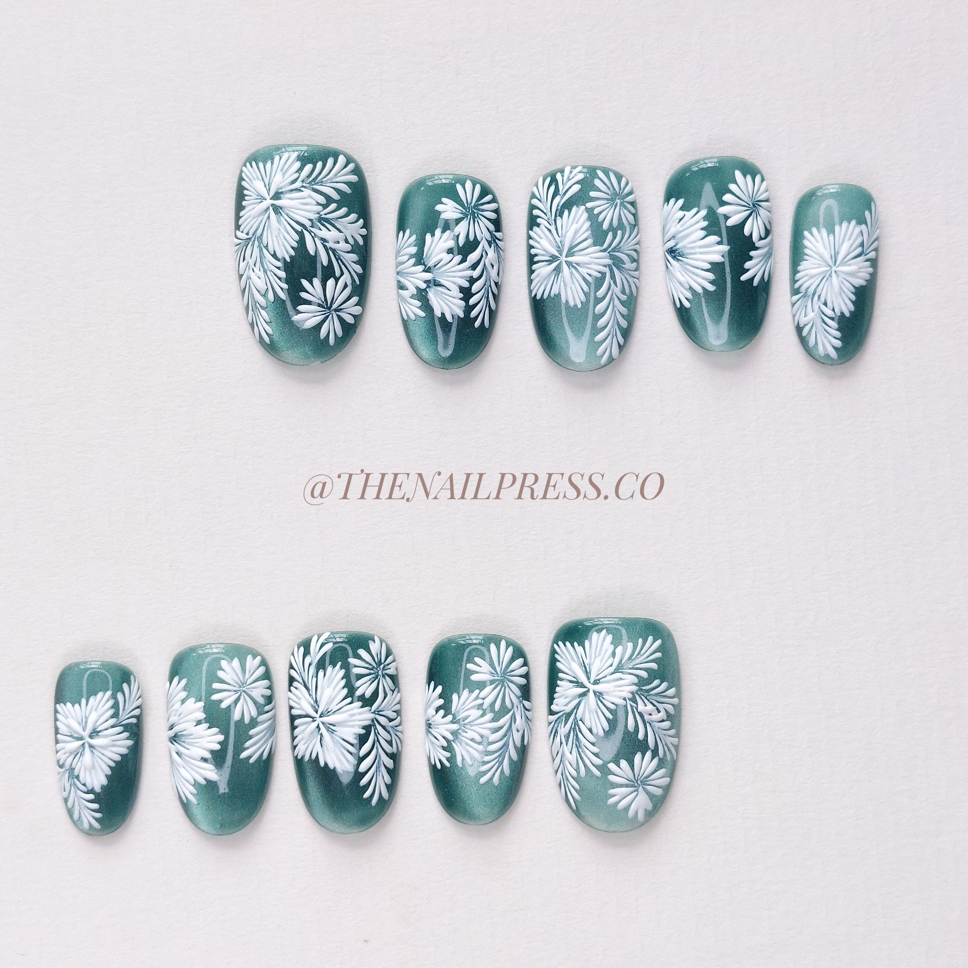 Discover elegance with Mystic Green Embroidery, featuring lush green cat-eye nails adorned with intricate floral embroidery. The fine details and subtle sparkle create a mystical, nature-inspired charm. The medium rounded shape enhances its graceful appeal. These handmade press-on nails offer a salon-quality finish with effortless application.