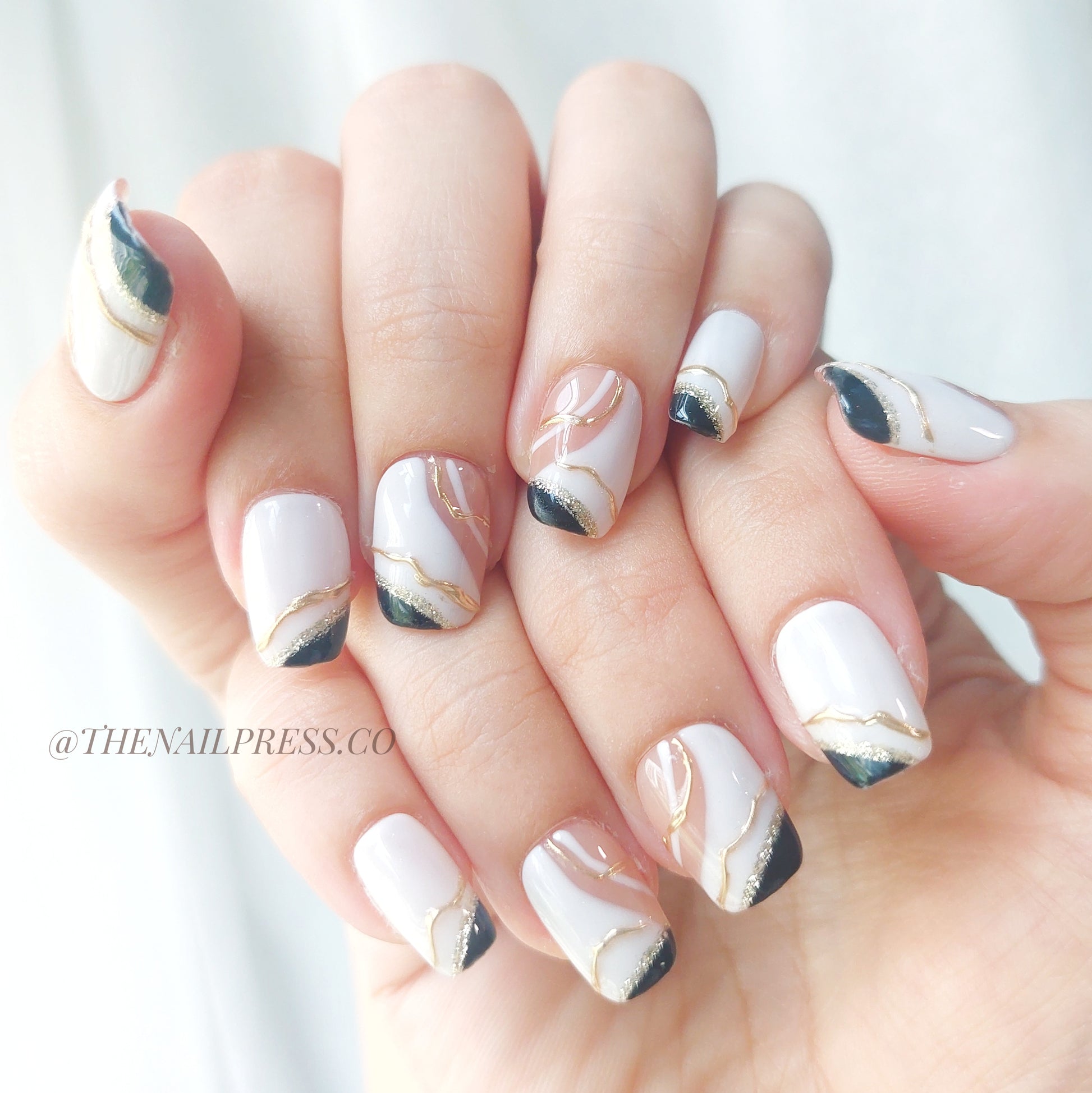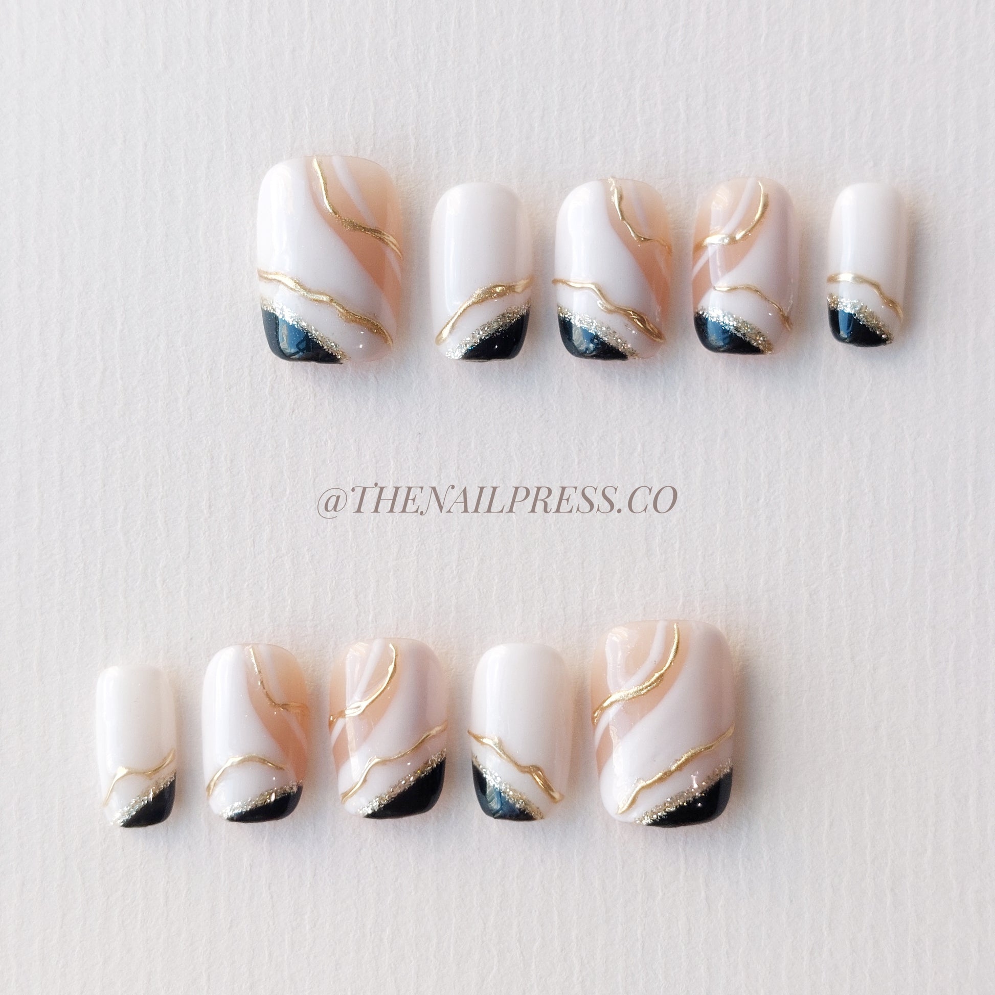 Embrace modern elegance with Noir Sophistication. Sleek black, white, and gold abstract accents create a bold, refined look. Short square shape provides a clean, contemporary silhouette. Handmade, reusable, and salon-quality for nails that are effortlessly striking and polished.