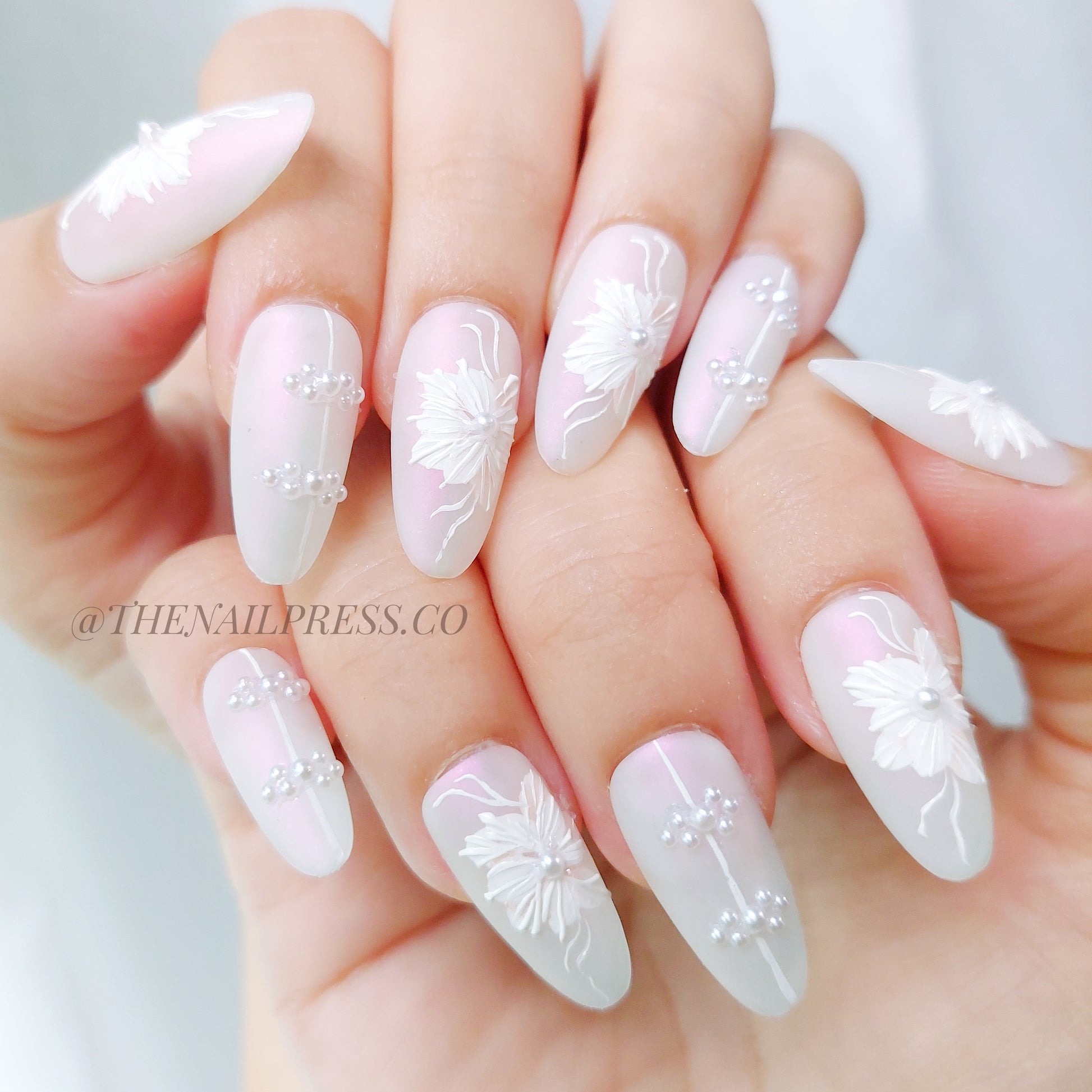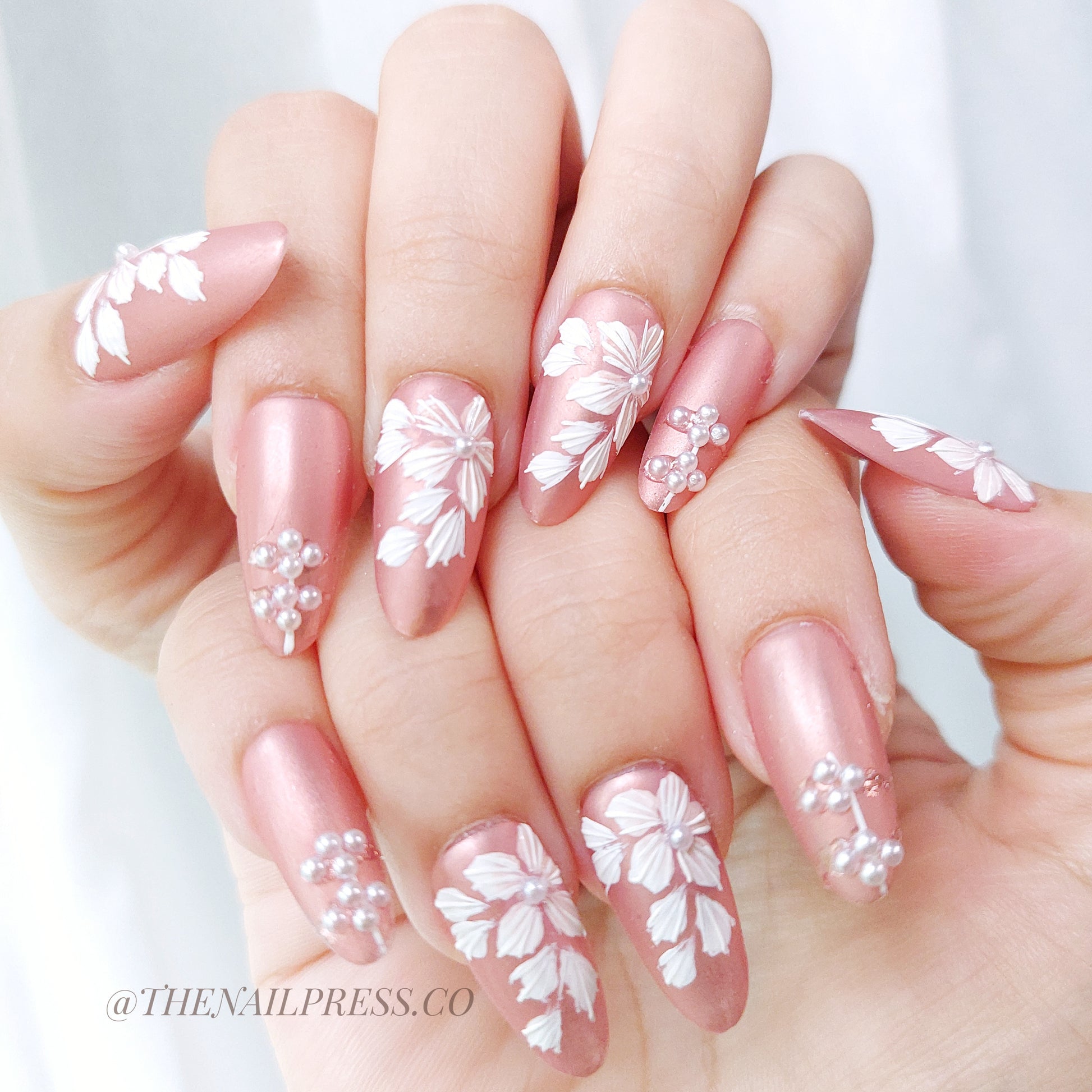 Indulge in elegance with Oriental Silk Threaded Blooms, where soft hand-drawn blooms meet delicate silk-inspired embroidery on a smooth satin-finish base. The medium oval shape enhances its timeless, feminine charm. Handmade and reusable, these nails deliver a salon-quality finish for effortlessly polished style.