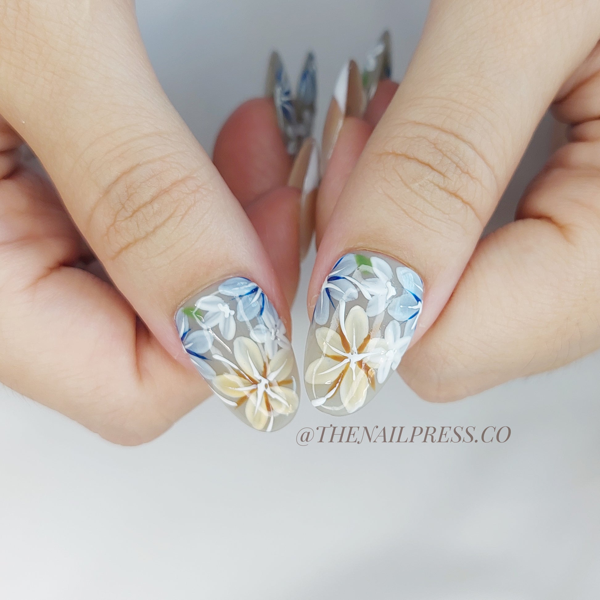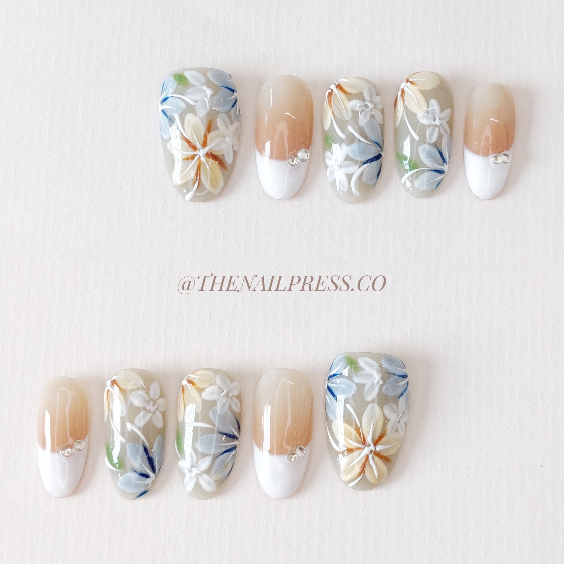 Soft brown and blue florals pair with chic French tip accents for a painterly, garden-inspired look. The short oval shape offers a polished, comfortable fit perfect for everyday wear. These handmade press-on nails provide a salon-quality finish with effortless application.