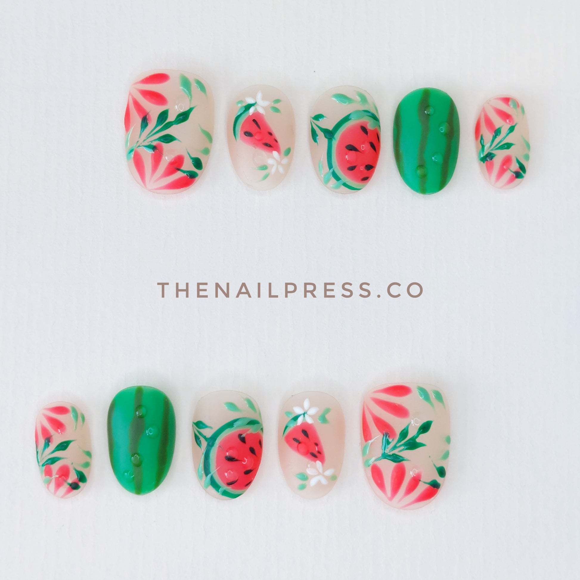 Bright watermelon hues meet refreshing tropical vibes with a playful matte finish and dewy water droplet details. The short rounded shape offers a polished, comfortable fit perfect for everyday wear. These handmade press-on nails provide a salon-quality finish with effortless application.