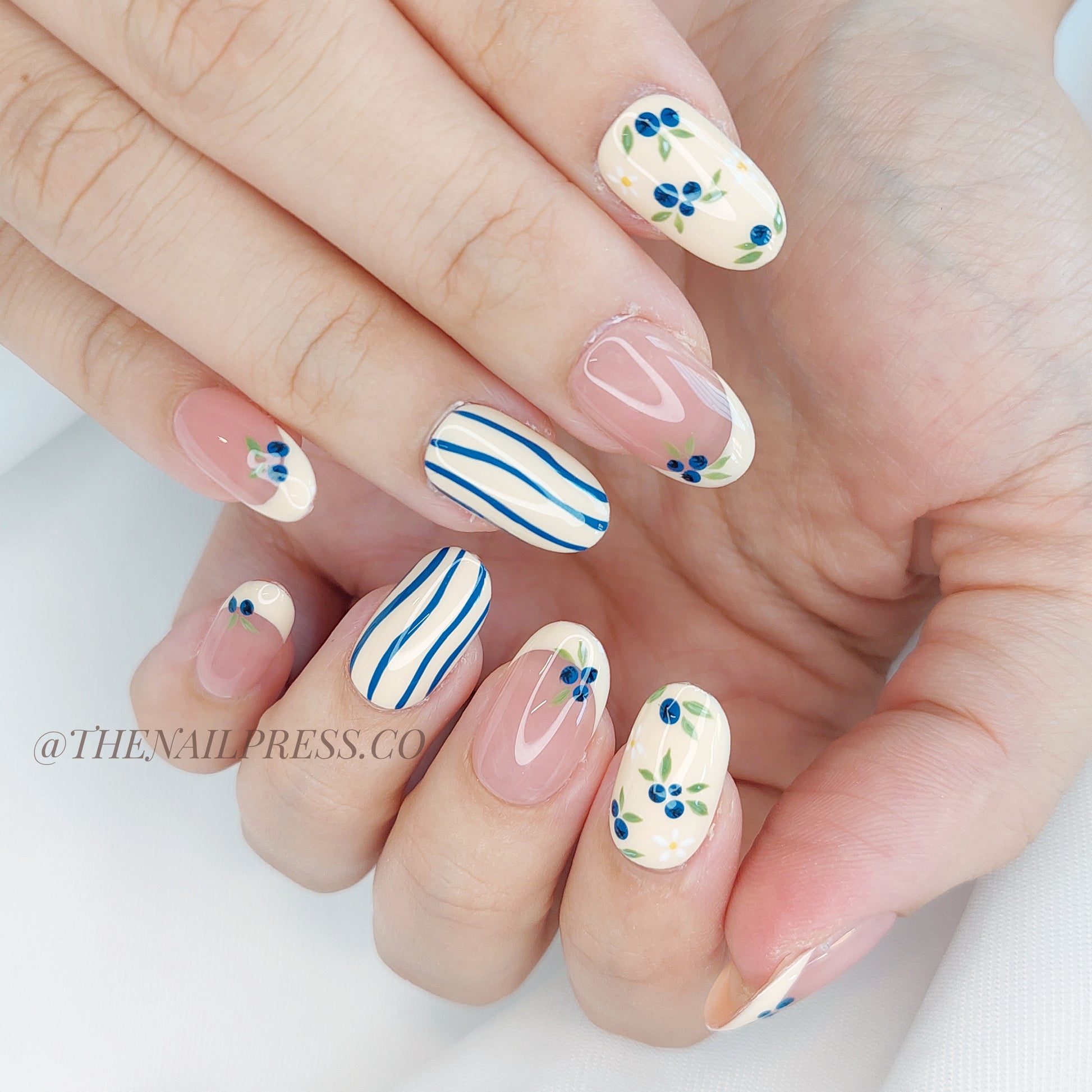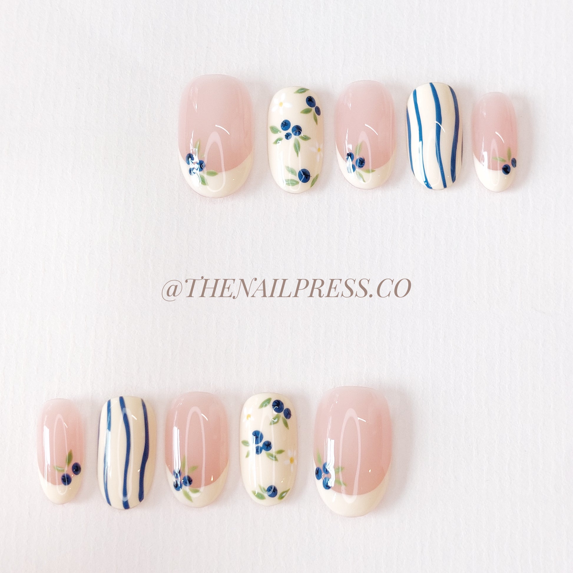 Delightful blueberries paired with delicate petit daisies create the fresh, charming style of Petit Berry. The medium oval rounded shape offers a graceful silhouette ideal for everyday elegance. These handmade press-on nails offer a salon-quality finish with effortless application.