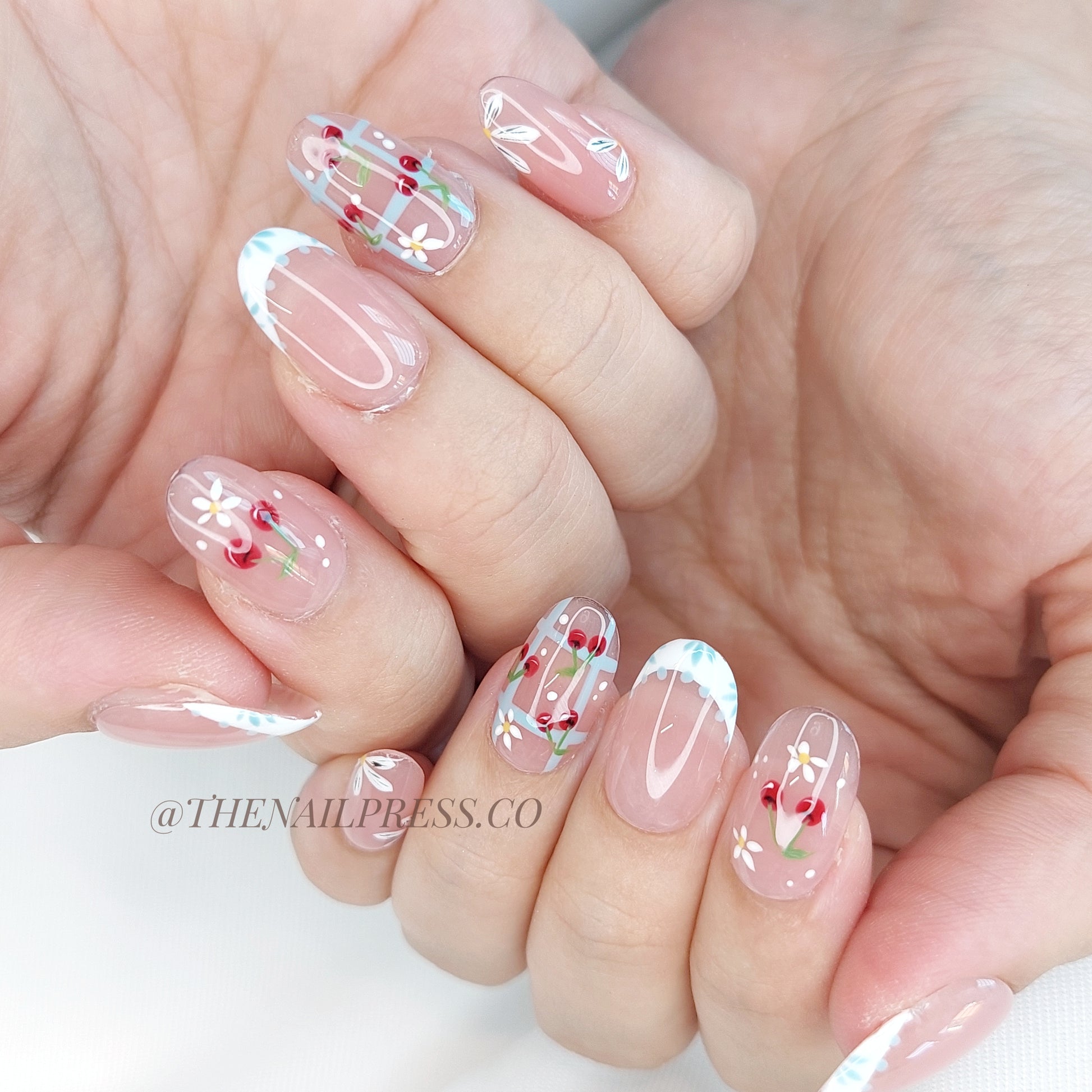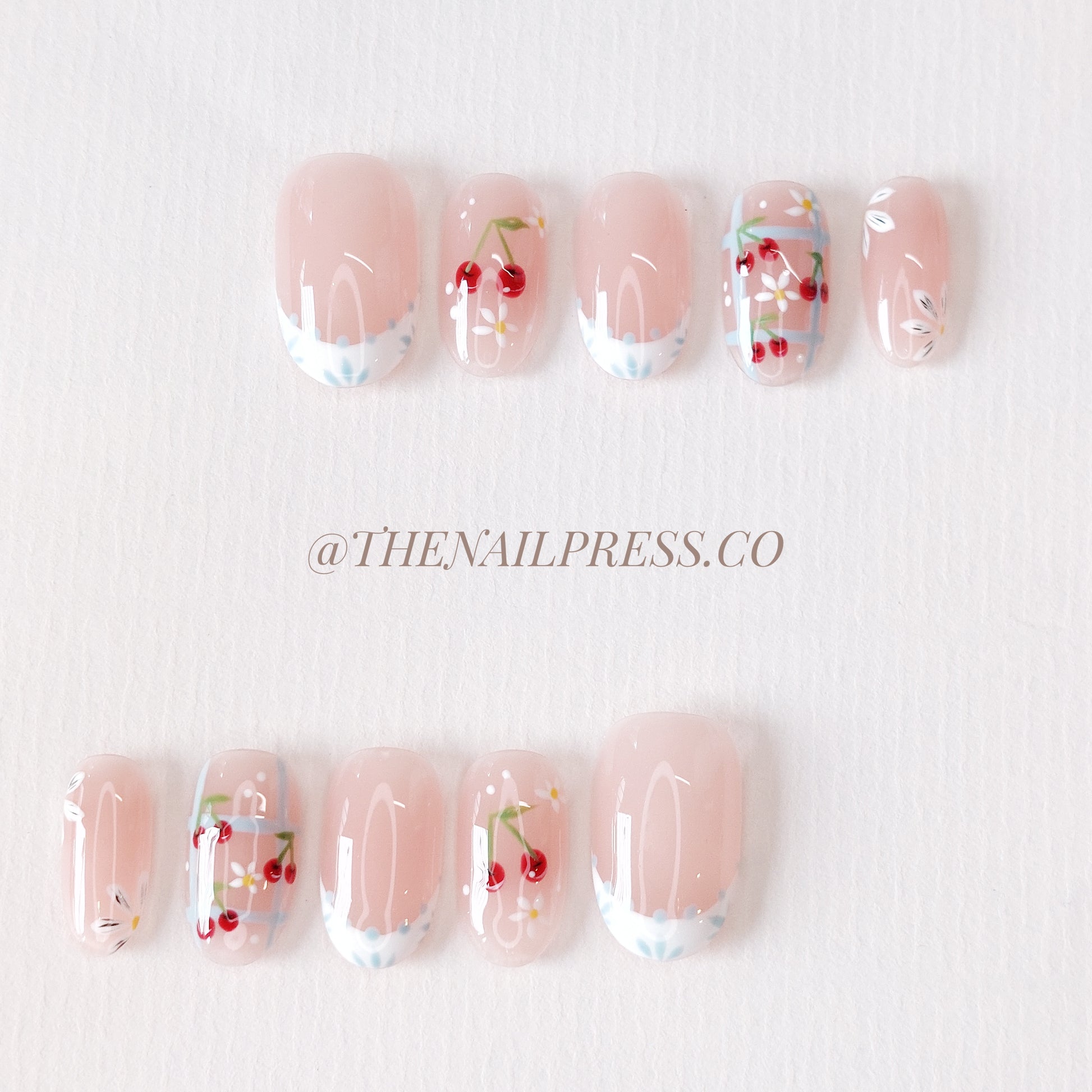 Charming cherries paired with delicate petit daisies create the sweet, playful style of Petit Cherry. The medium oval rounded shape offers a flattering and elegant silhouette ideal for everyday wear. These handmade press-on nails offer a salon-quality finish with effortless application.