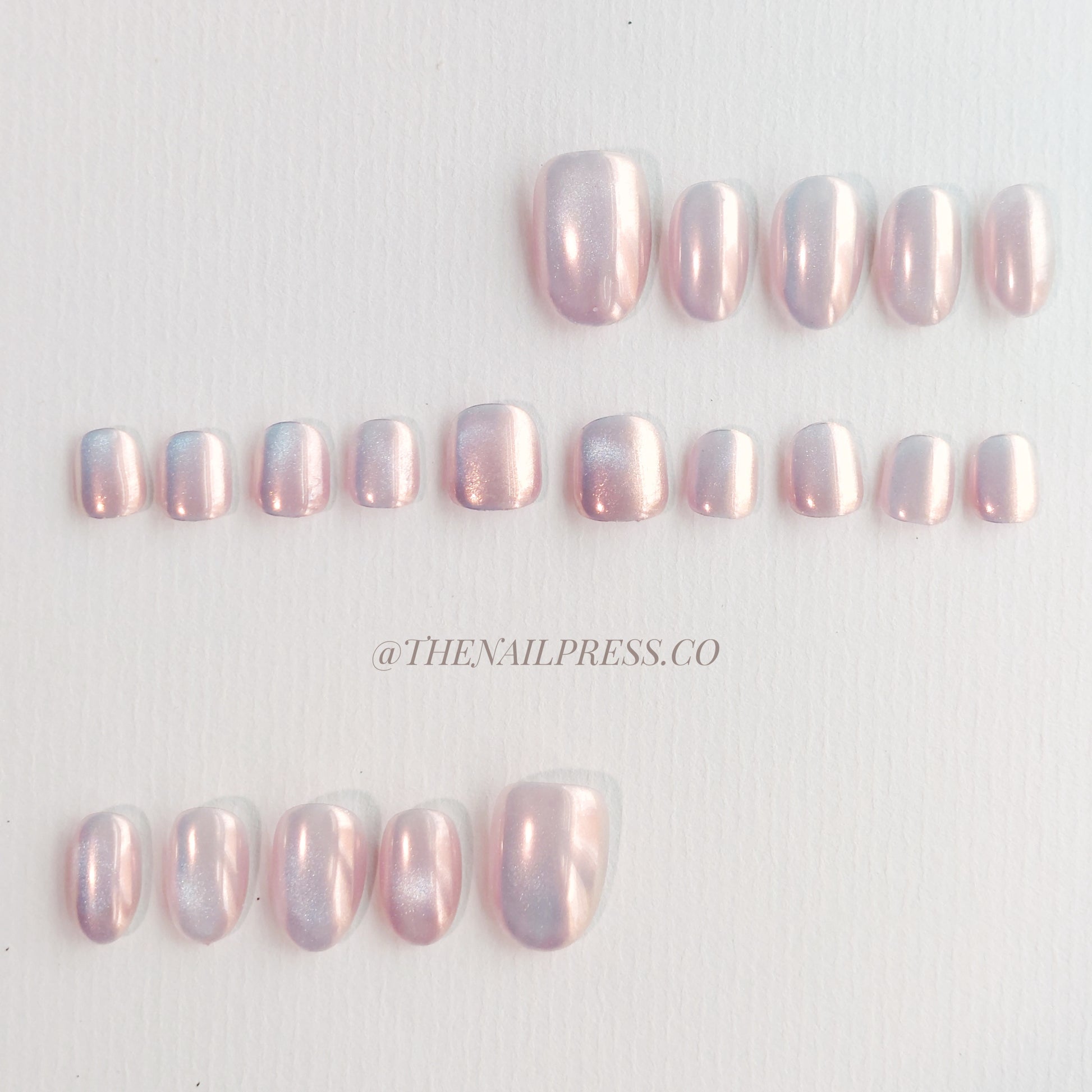 Illuminate your nails with Pink Moonstone. This captivating set features a lustrous pink chrome finish with a stunning blue sheen that glimmers in the light, enhanced by a mesmerising cat-eye effect for added mystique. The short rounded shape ensures a flattering, comfortable fit, while kids' sizes make this design accessible for all. Handcrafted and reusable, these nails deliver a salon-quality finish for effortlessly polished style.