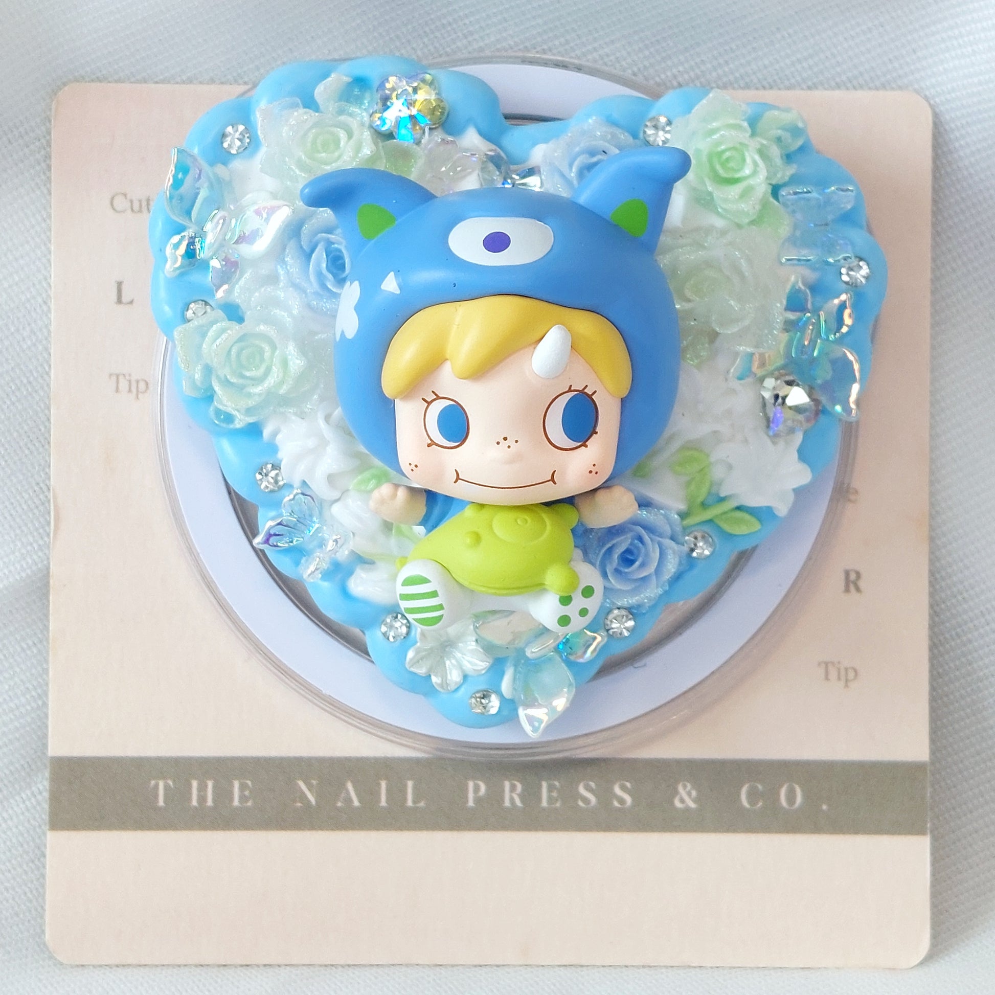 Add a touch of cuteness to your phone with Polar from the Going Out With Me Series. Featuring a bright blue base decorated with delicate floral details, this design is sweet, cheerful, and full of charm. Handmade and unique, it’s functional and topped with an authentic Pop Mart Pop Bean.