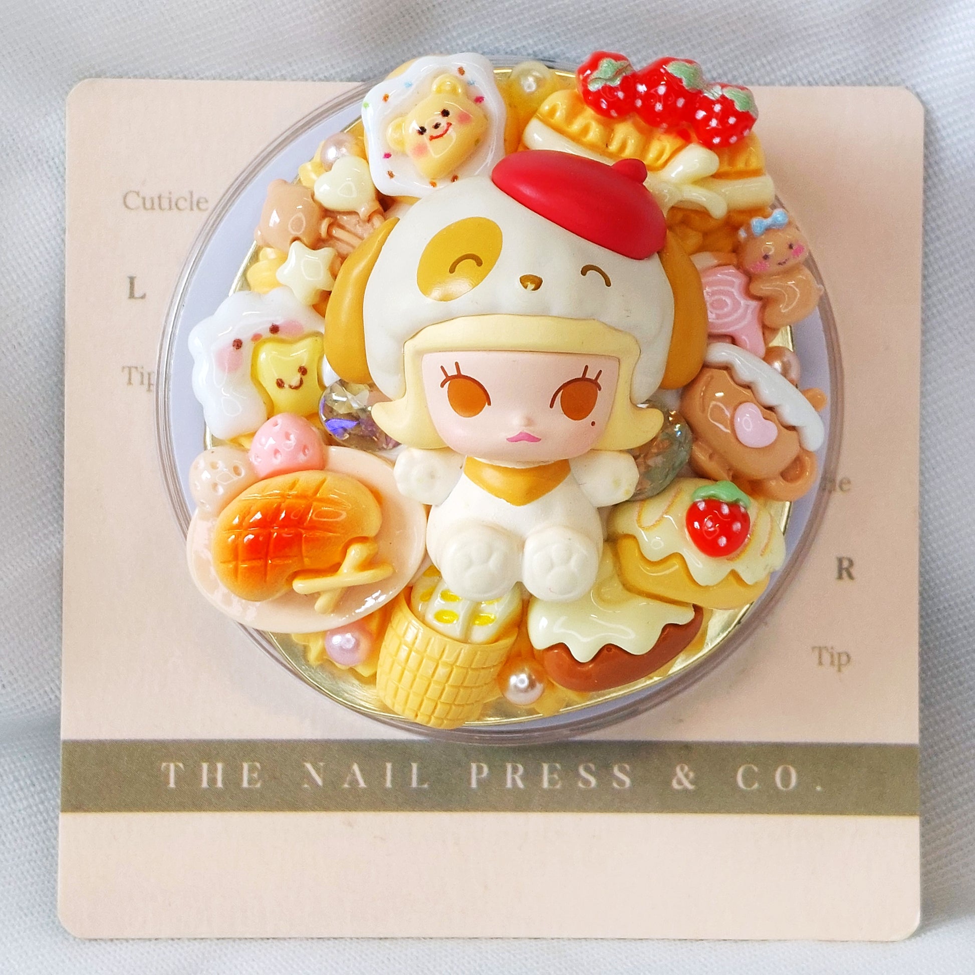 Add a cozy, playful touch to your phone with Molly from the Pyjama Party Series. Featuring calming beige tones, cute food-themed embellishments, and crafted on a unique gold medal plate with a quirky shape, this design is sweet, charming, and full of personality. Handmade and unique, it’s functional and finished with an authentic Pop Mart Pop Bean.