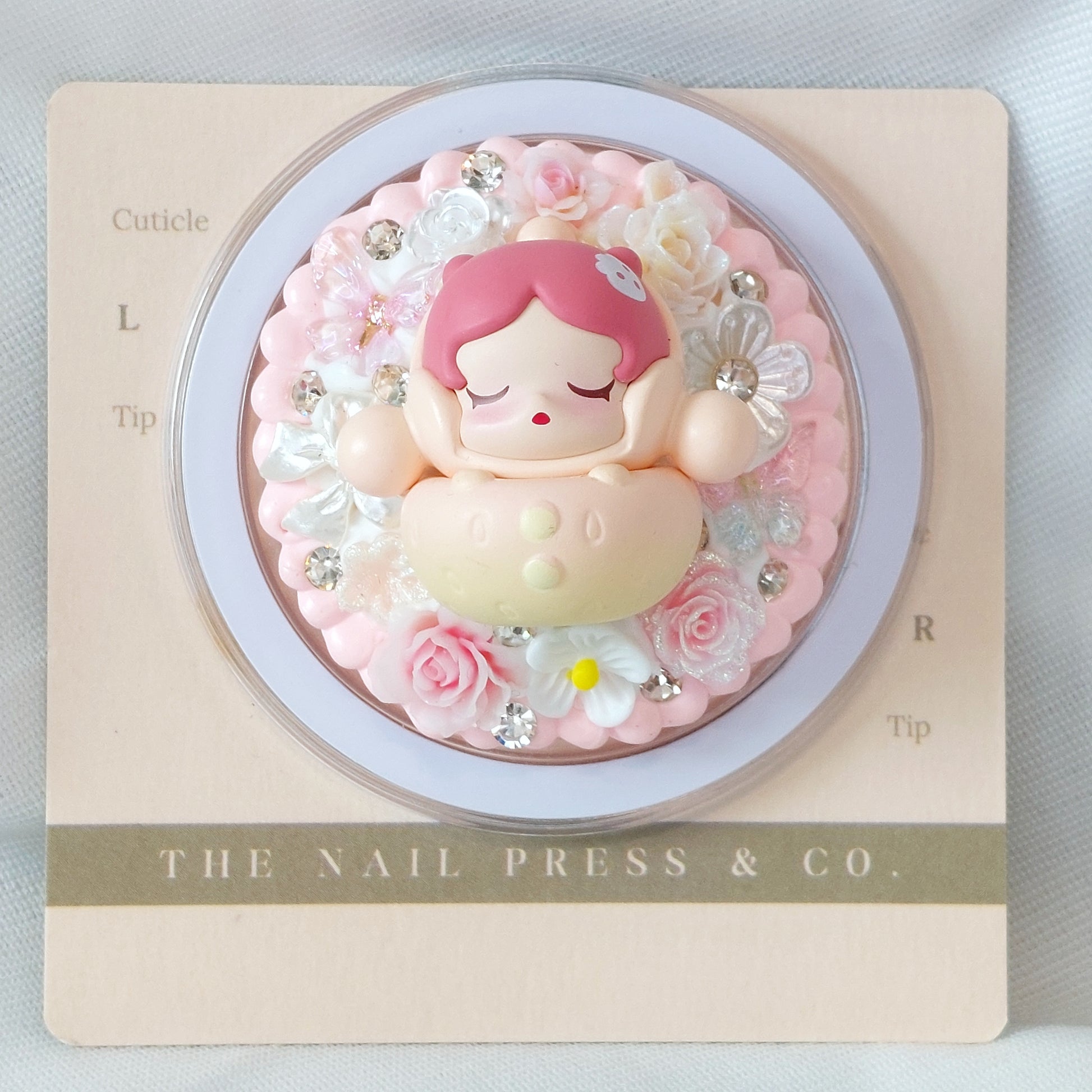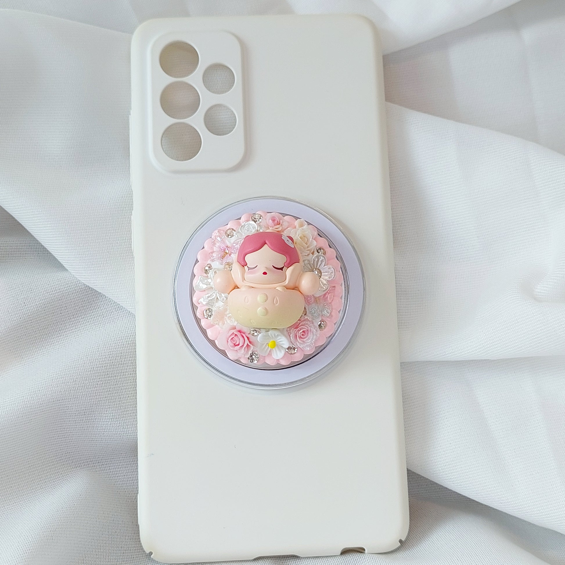 Add a playful, charming touch to your phone with Skullpanda from the Strawberry Series. Featuring a sweet pink base adorned with delicate flowers, blooming roses, and sparkling gems, this design is whimsical, elegant, and full of personality. Handmade and unique, it’s functional and finished with an authentic Pop Mart Pop Bean.