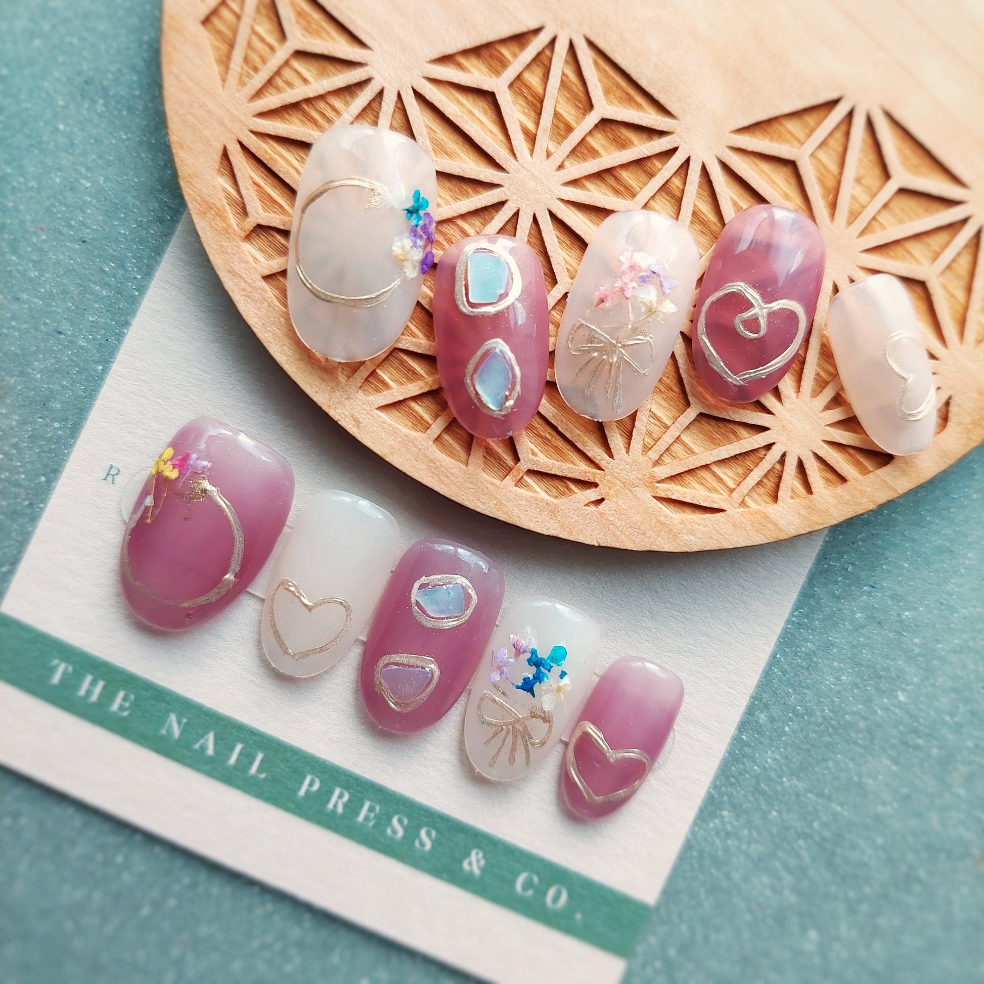 Delicate, real pressed flowers meet a timeless design in Pressed Botanicals. Each nail is carefully handcrafted to showcase natural textures and soft, elegant colours, creating a graceful, botanical statement. Medium rounded shape provides a classic, flattering silhouette. Handmade, reusable, and salon-quality for nails that look effortlessly beautiful and last all day.
