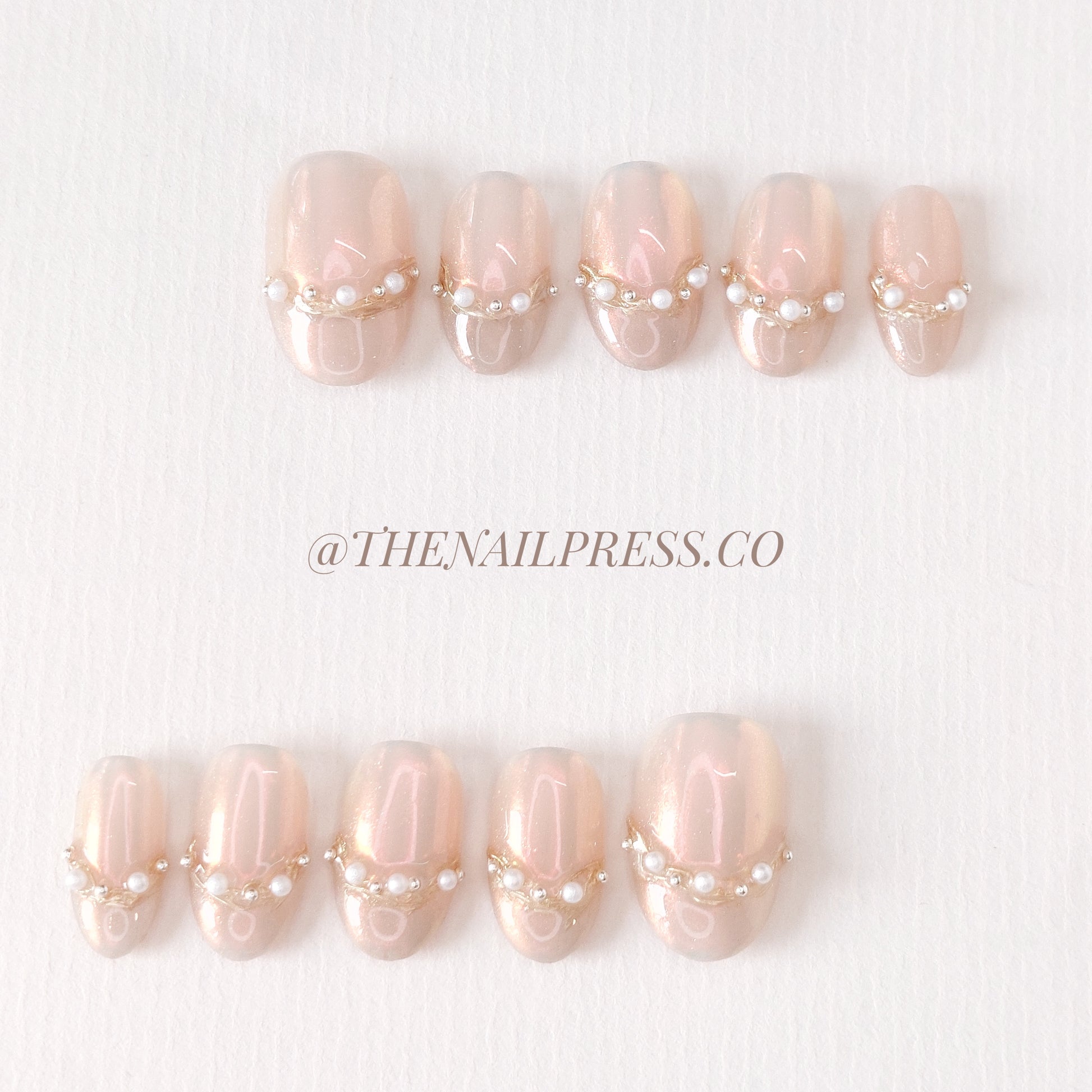 Soft pink chrome paired with dreamy pink cat-eye French tips, accented with delicate pearls, creates the refined and radiant style of Pretty in Pearl. The medium oval rounded shape adds a graceful silhouette, perfect for adding a touch of luxury to any occasion. These handmade press-on nails offer a salon-quality finish with effortless application.