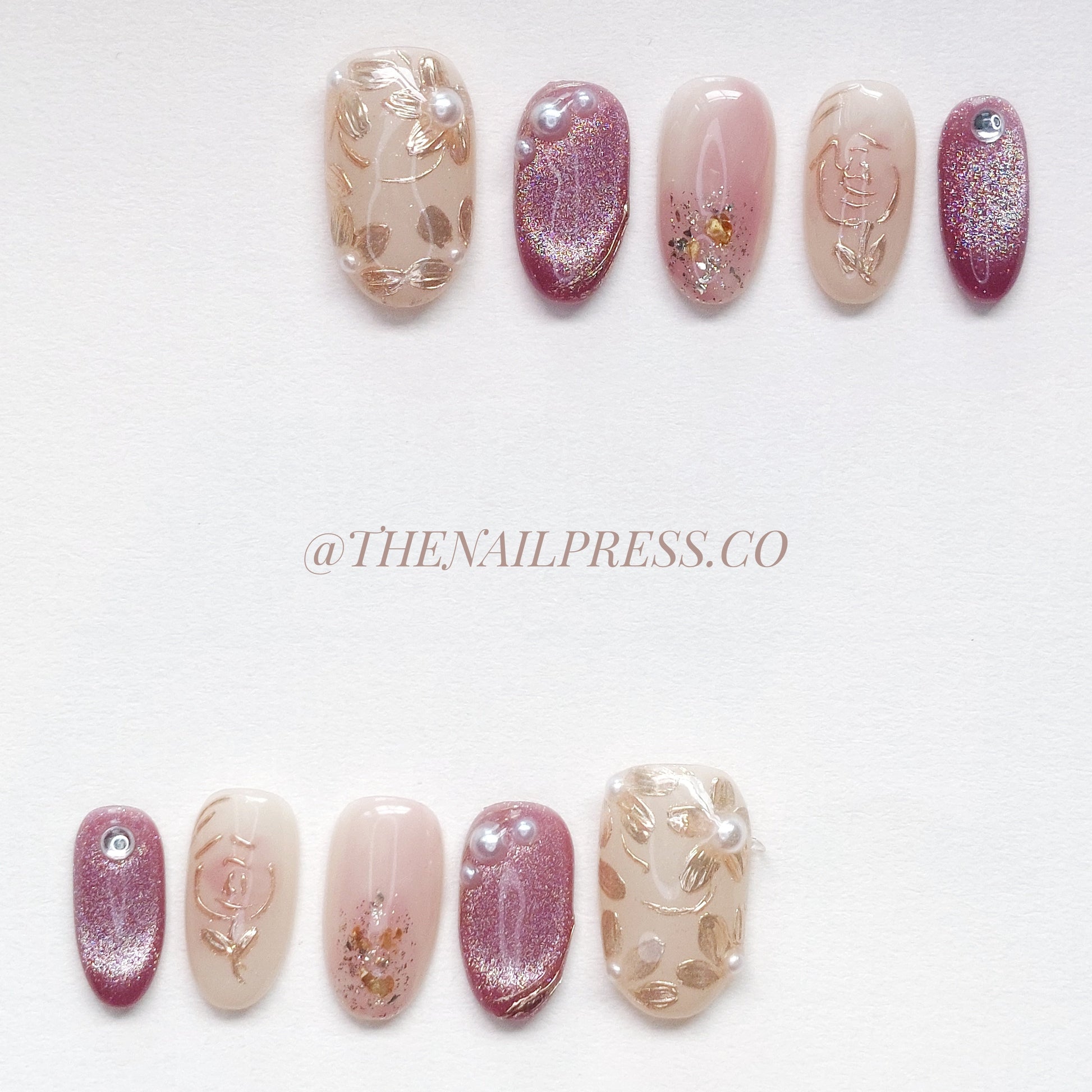 Exuding timeless elegance, Radiant Rose features a rich rosy cat-eye shimmer that shifts beautifully, complemented by delicate gold-accented flowers. The medium rounded shape enhances the luminous finish, creating a perfect balance of romance and sophistication. These handmade press-on nails offer a salon-quality finish with effortless application.