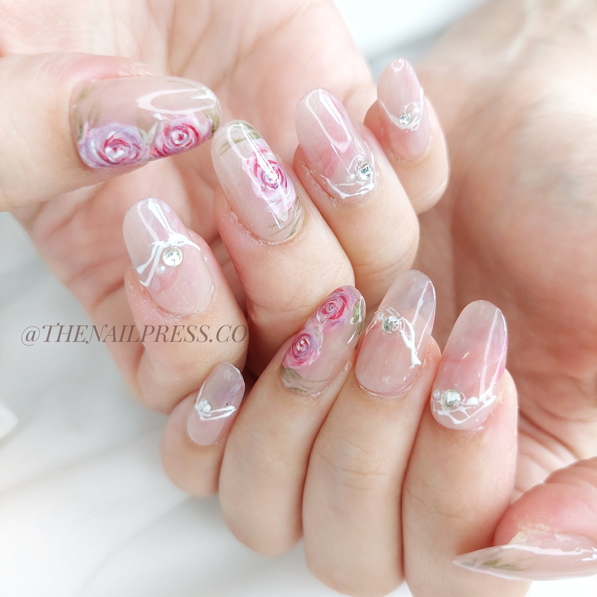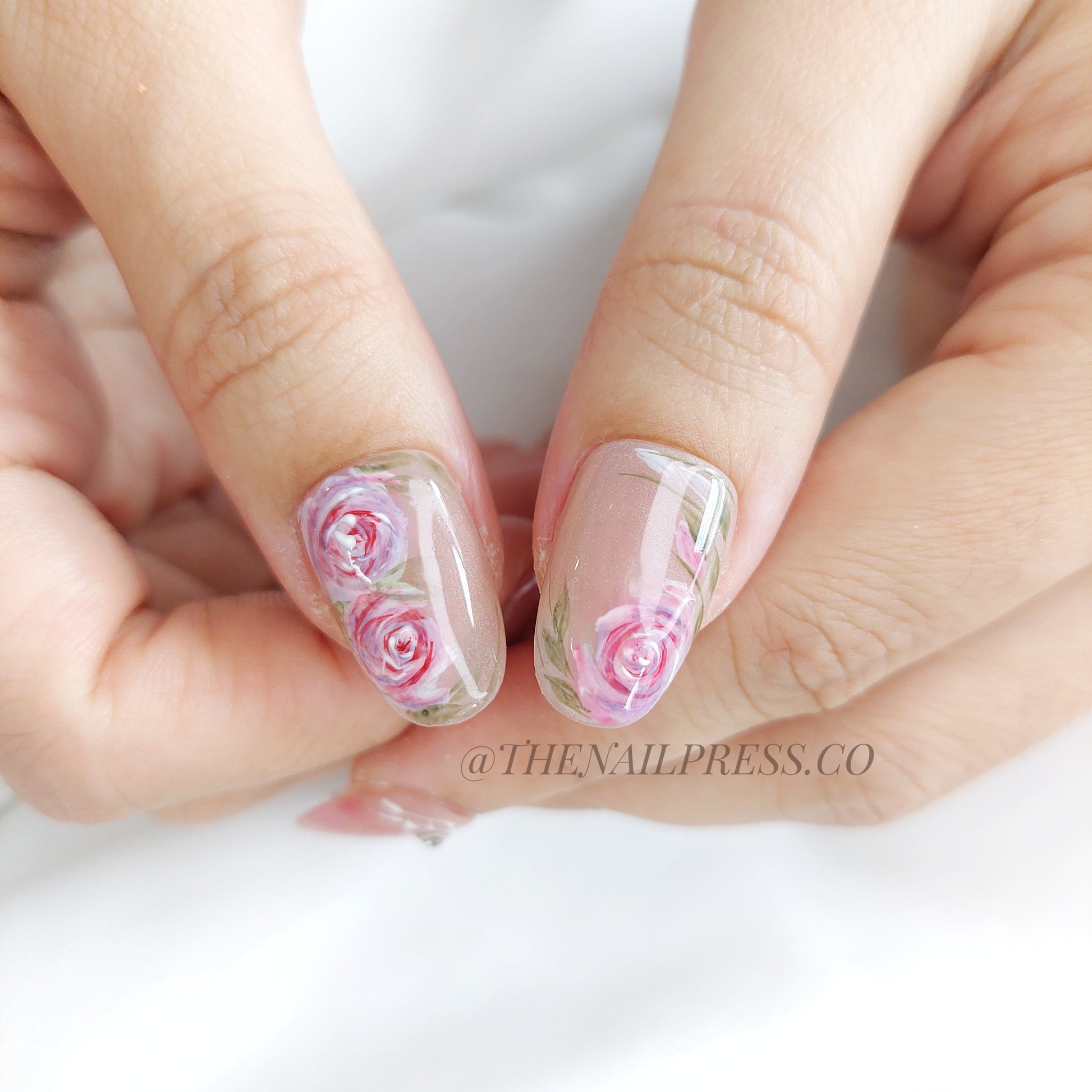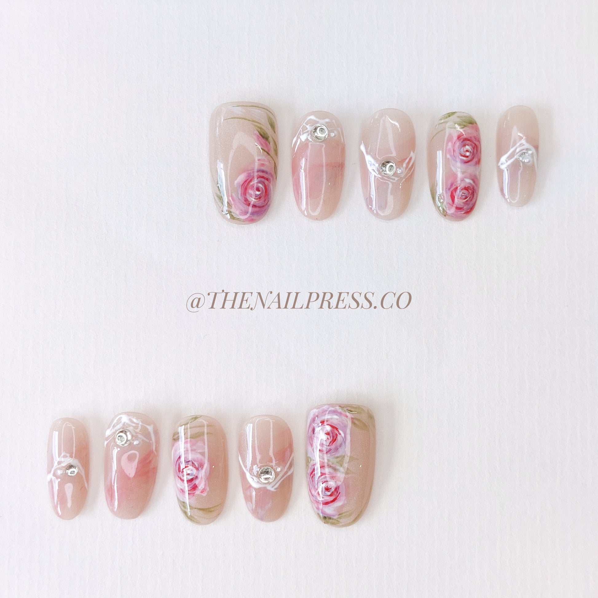 Delicate watercolour roses bloom across a clean nude base in Rosé Palette, creating a soft, graceful, and artistic look. The medium oval rounded shape enhances its timeless charm, perfect for everyday sophistication or romantic occasions. These handmade press-on nails are reusable and offer a salon-quality finish for effortless beauty.