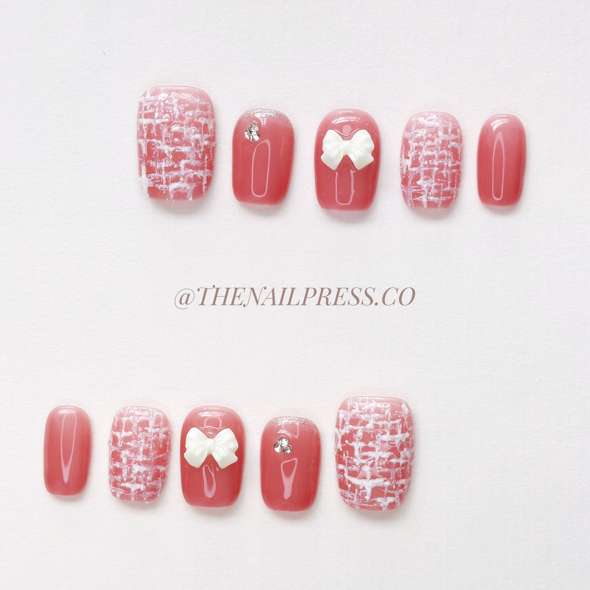 Chic meets sweet in Rosy Bow Weave, a sophisticated design that blends classic elegance with a playful twist. The rosy pink base is adorned with a stylish tweed-inspired pattern and finished with dainty bow embellishments, adding charm and grace. The short square shape offers a clean, comfortable fit, making it perfect for both everyday wear and special occasions. Available in adult and kids' sizes, this design is ideal for coordinated looks or a special treat. These handmade press-on nails offer a salon-quality finish with effortless application.