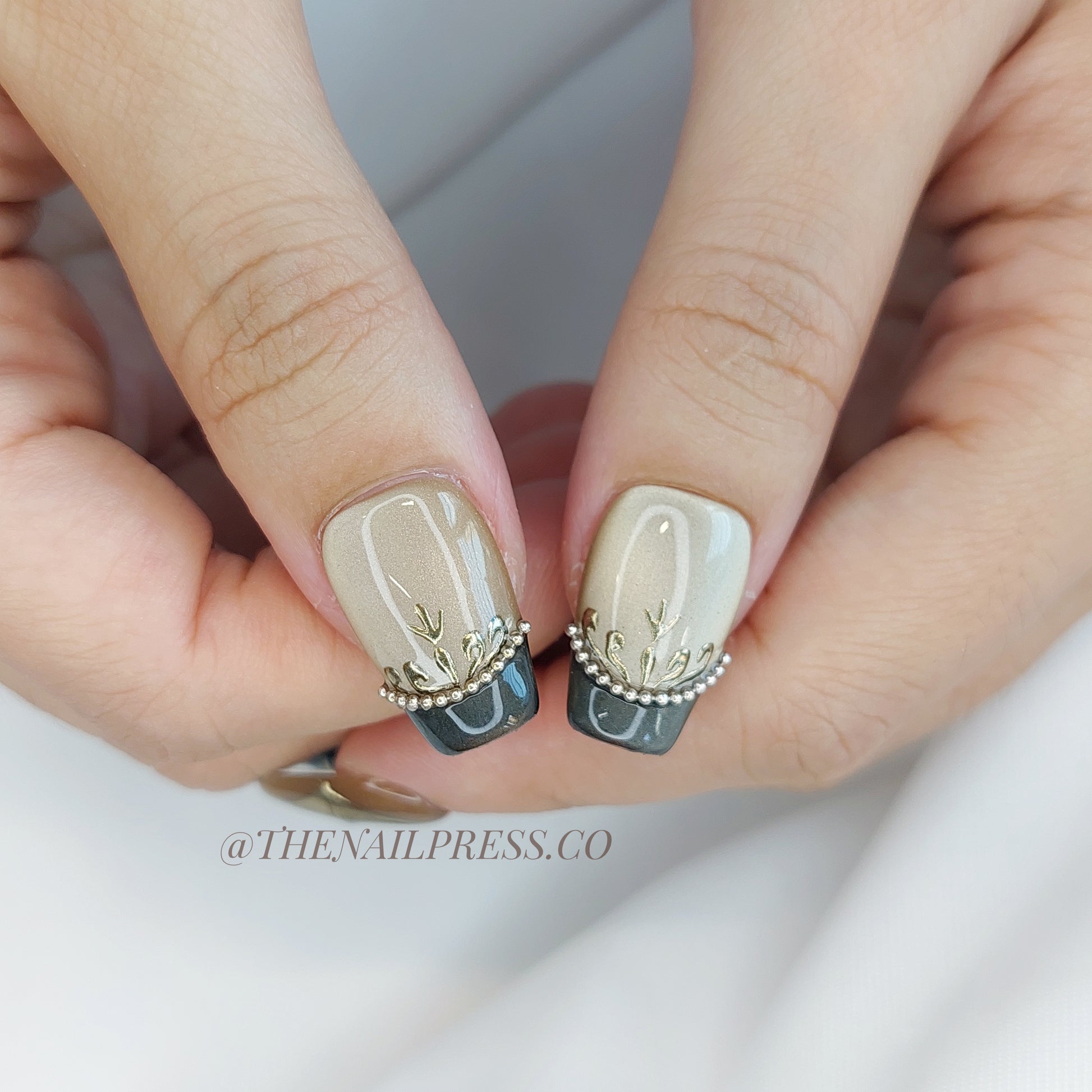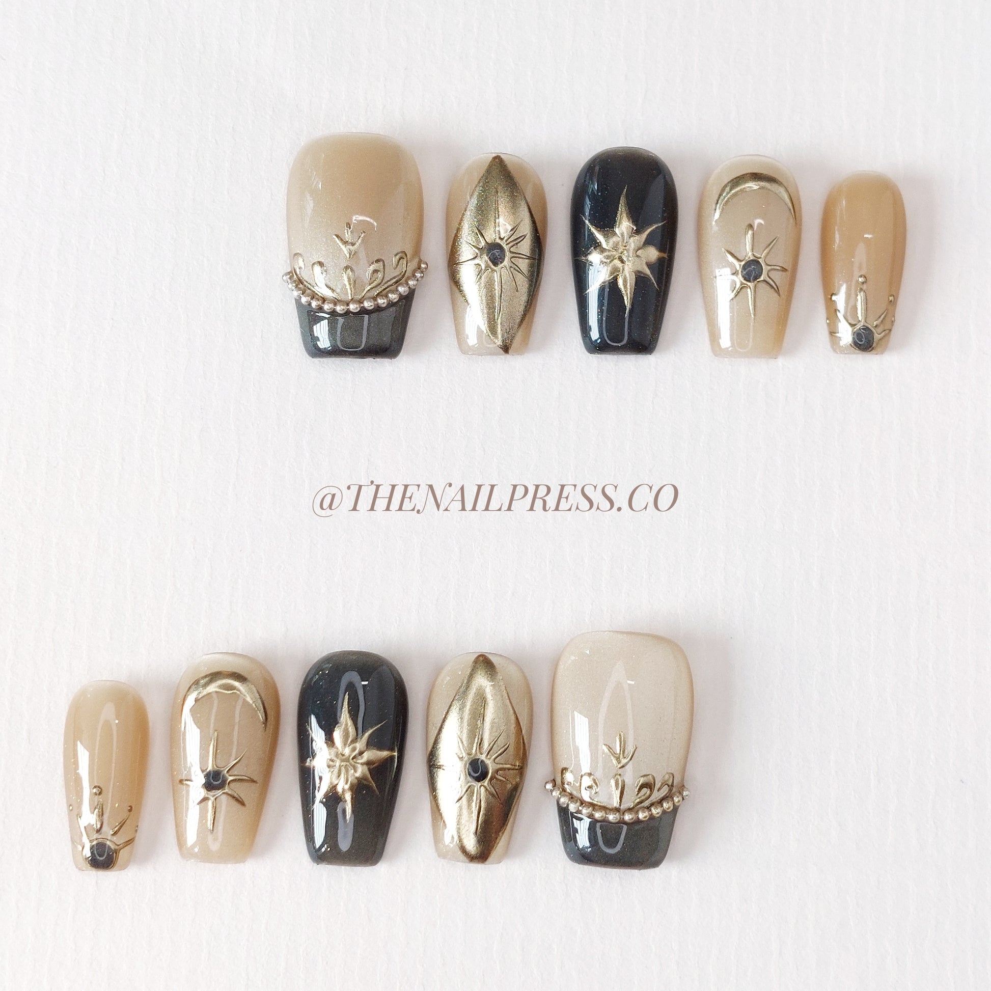 Deep black nails with metallic gold accents inspired by Egyptian and celestial motifs create the mystical style of Sacred Starlight. The short coffin shape adds an edgy, modern finish. These handmade press-on nails offer a salon-quality finish with effortless application.