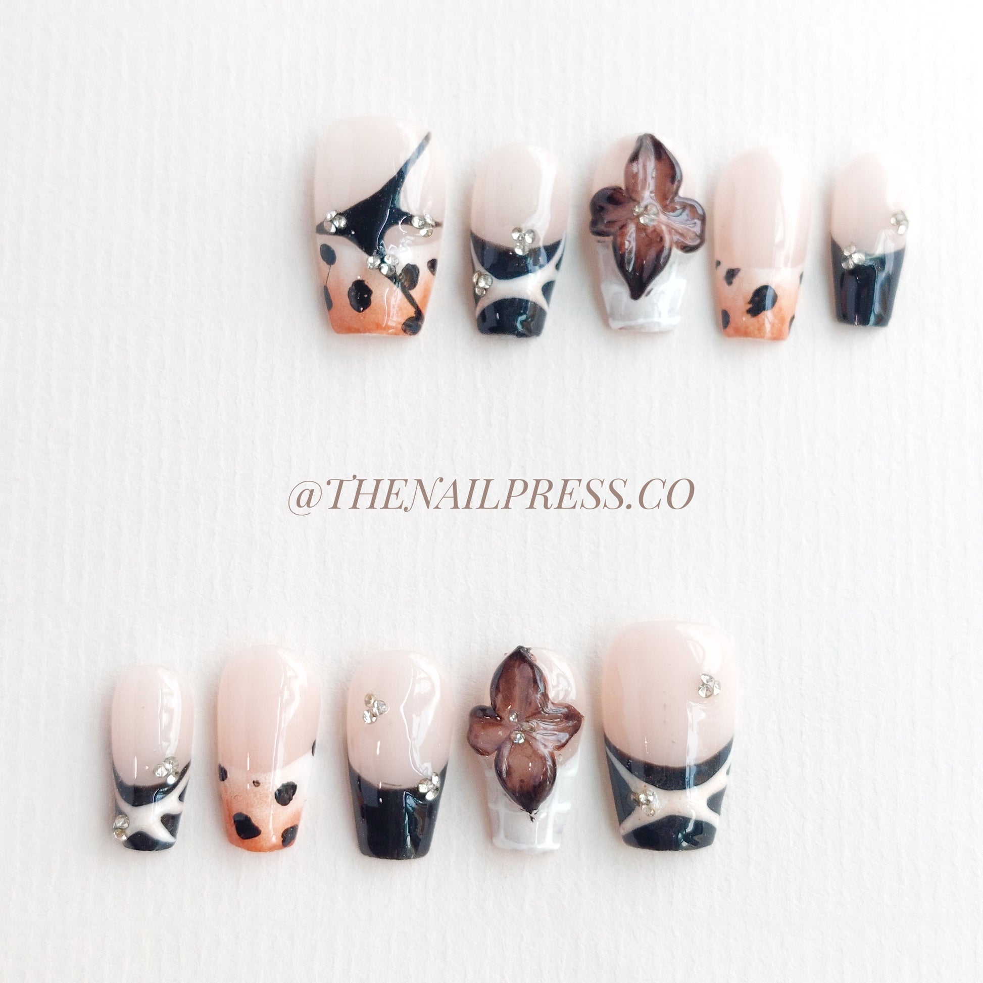 Step into the wild with Safari Chic, featuring fierce animal prints blended with warm browns and tans for an adventurous, sophisticated look. 3D sculpted flowers and sparkling gems add a touch of luxury and dimension to the design. The short coffin shape enhances the bold, elegant silhouette, perfect for adding exotic flair to your style. Handcrafted and reusable, these nails provide a salon-quality finish that keeps your nails striking and effortlessly polished.