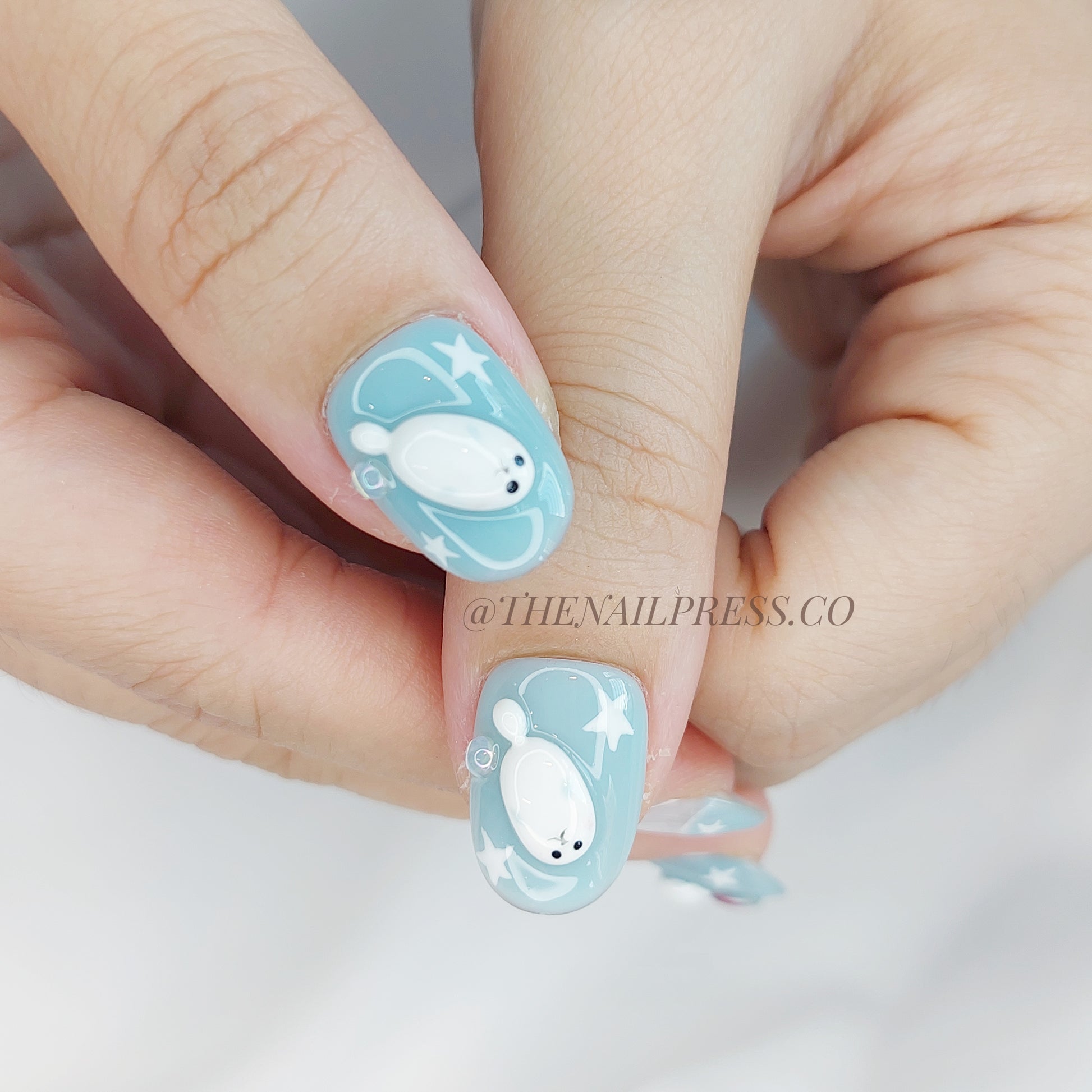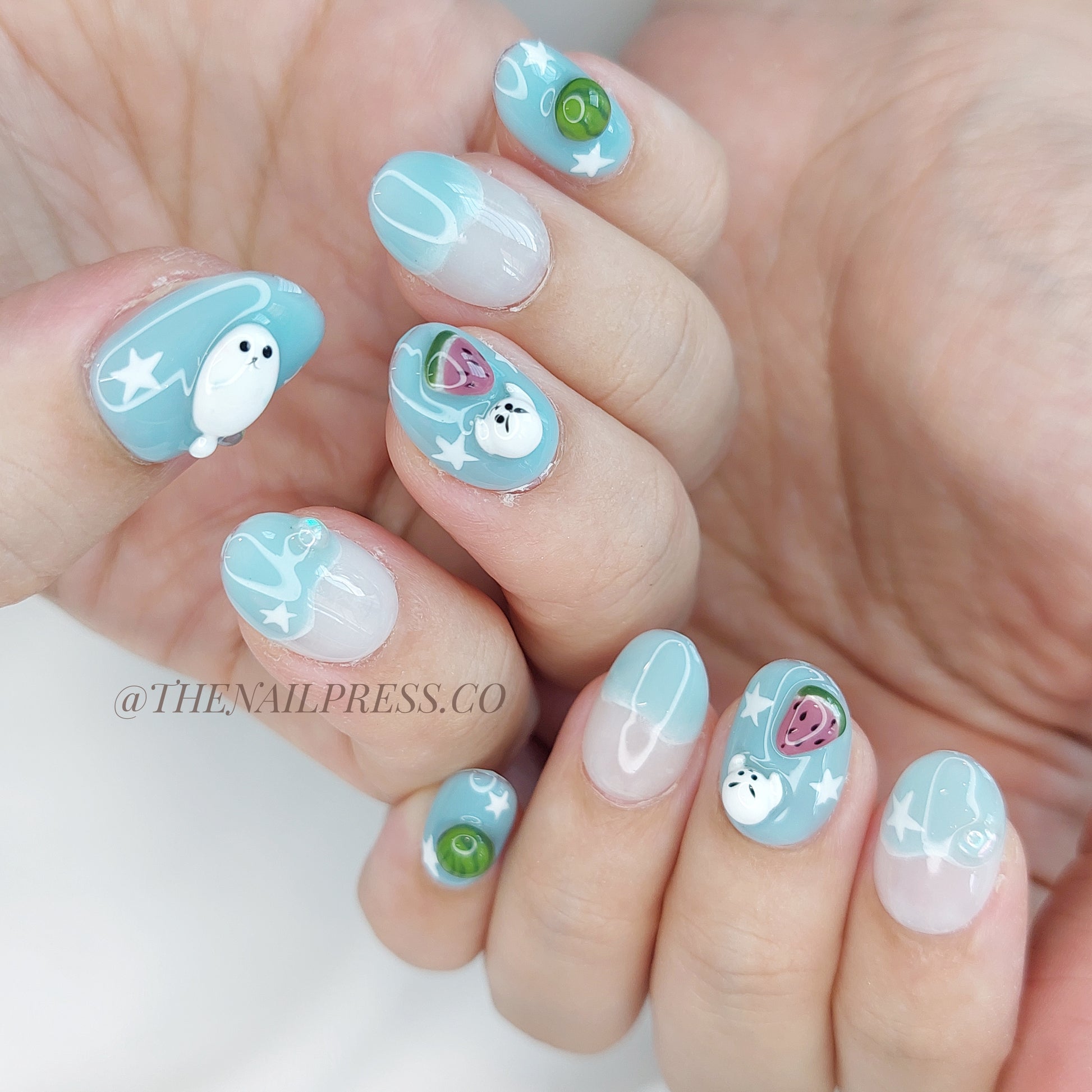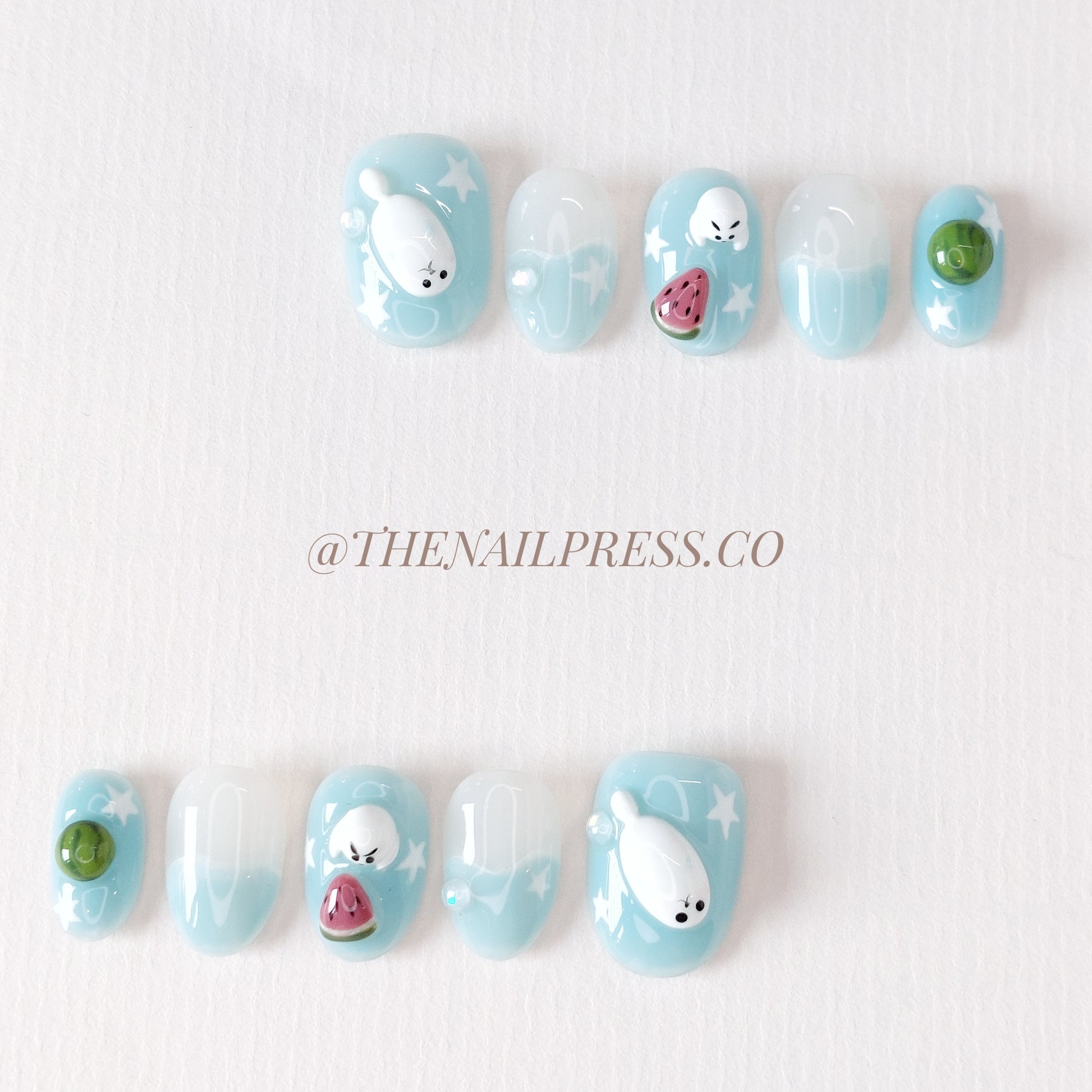 Adorable 3D white seals lounge on a light blue watery base with juicy watermelon accents, capturing the playful charm of Seal Splash. The short rounded shape offers a comfortable, natural fit perfect for everyday wear. These handmade press-on nails offer a salon-quality finish with effortless application.