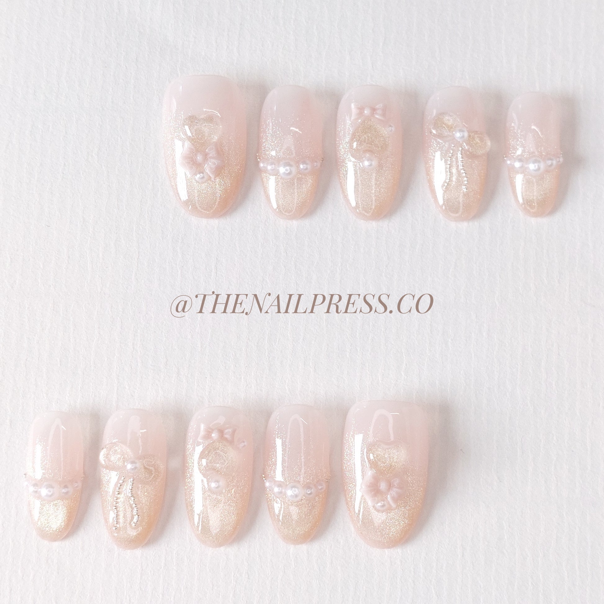 Glistening cat-eye tips accented with sculpted sweet bows and delicate girly motifs capture the sparkling elegance of Shimmer Charm. The short oval shape adds a soft, feminine silhouette perfect for any occasion. These handmade press-on nails offer a salon-quality finish with effortless application.