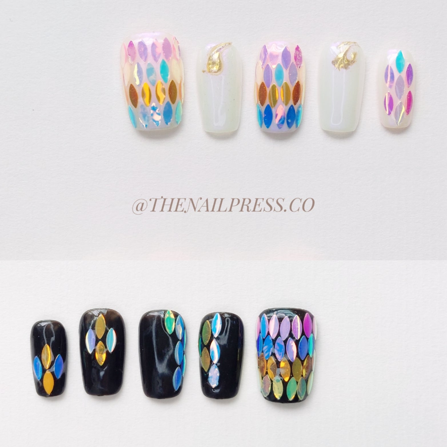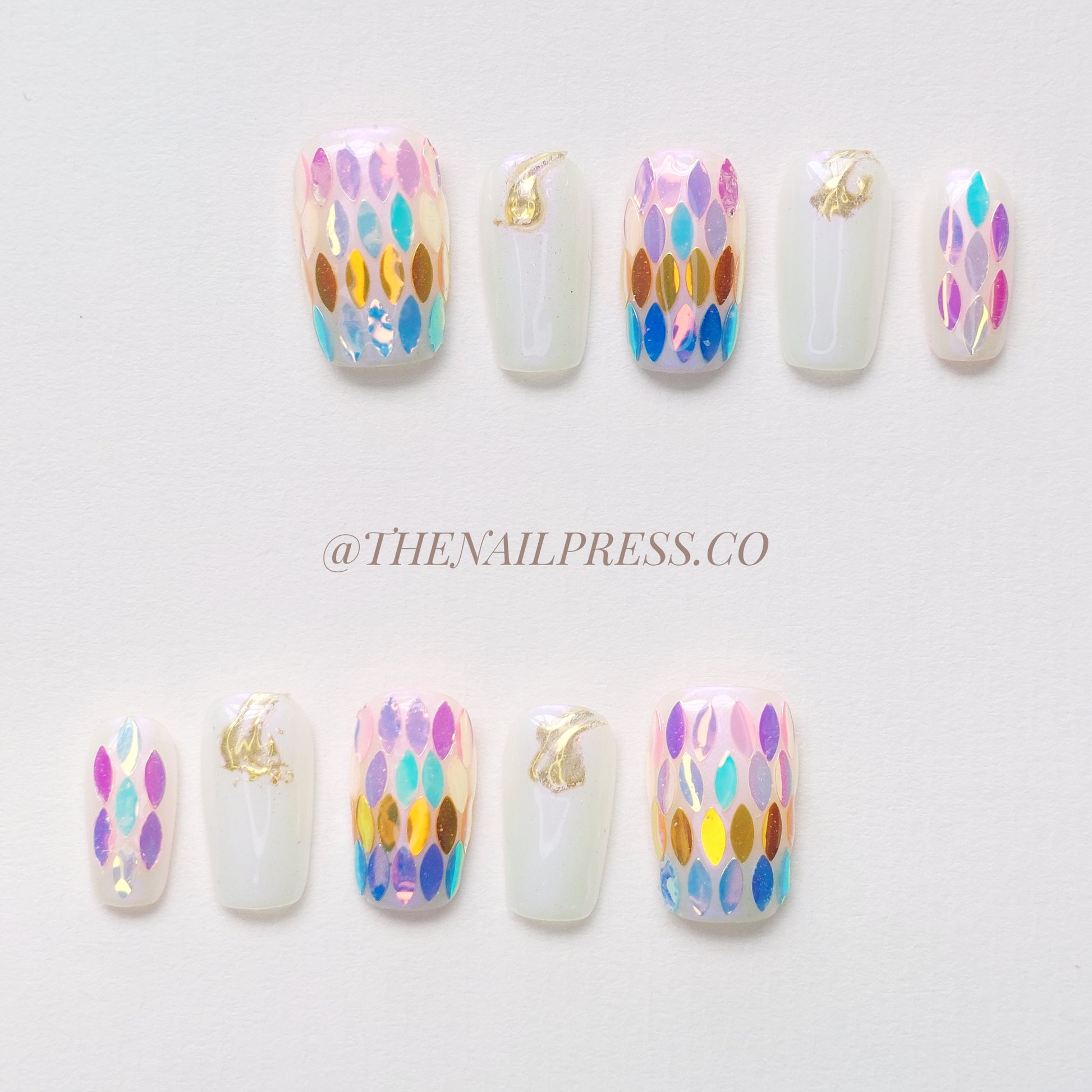 Unveil the ethereal beauty of Shimmering Scales, featuring a soft pearly white or deep midnight black base. Iridescent leaf-shaped sequins and gold accents capture the shimmering, fluid movement of the ocean, creating a mermaid-inspired look. The medium square shape enhances its sleek, modern appeal, perfect for those who want to embrace their inner sea goddess. These handmade press-on nails offer a salon-quality finish with effortless application.