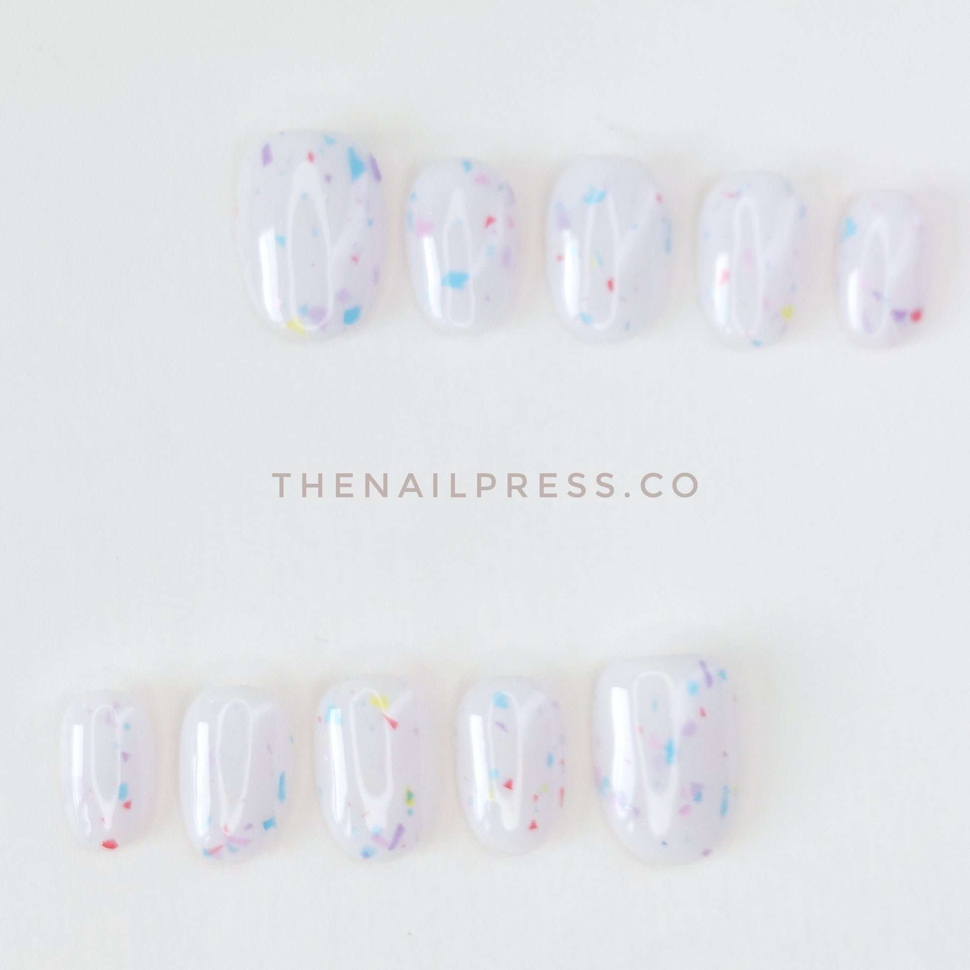 Light pink nails feature colourful terrazzo-inspired specks for a playful and whimsical look. The short rounded shape enhances the fun, effortless charm. These handmade press-on nails offer a salon-quality finish with effortless application.
