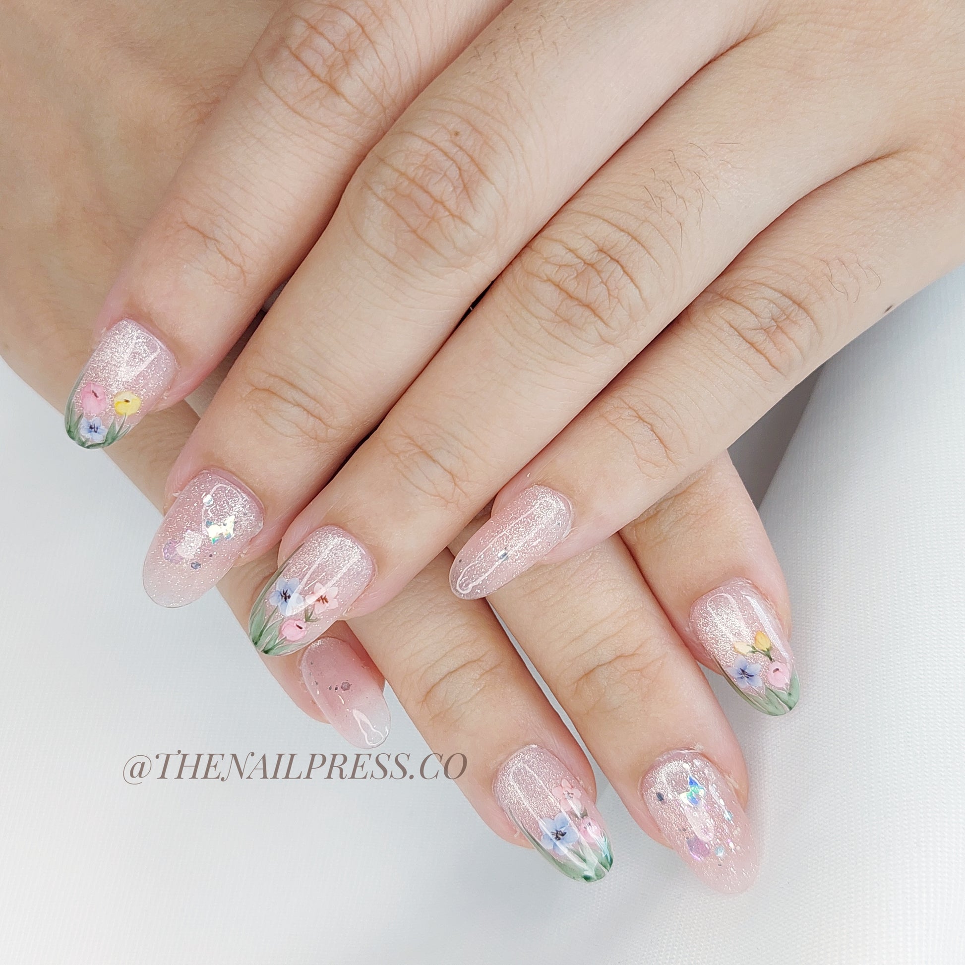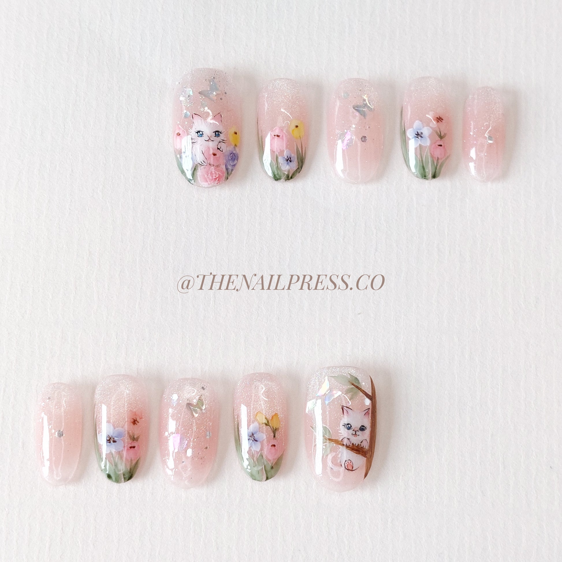 Adorable hand-drawn cats and delicate spring florals set on a sparkly pink base bring playful charm in Springtime Whiskers. The medium oval rounded shape adds a soft, flattering finish perfect for everyday whimsy. These handmade press-on nails are reusable and provide a salon-quality finish with effortless application.