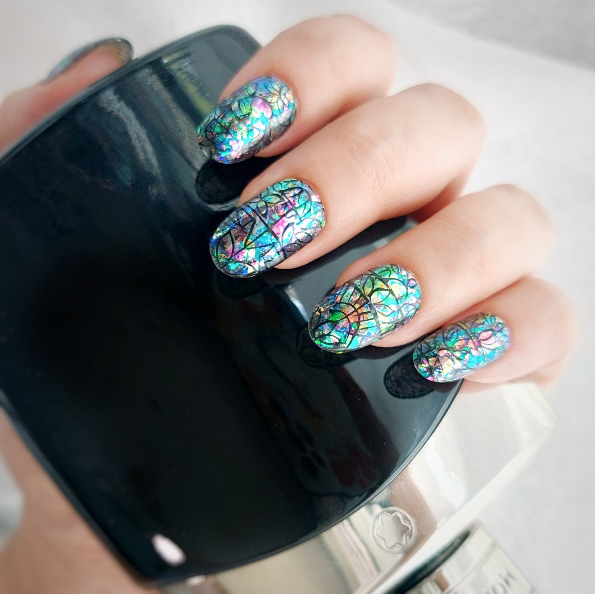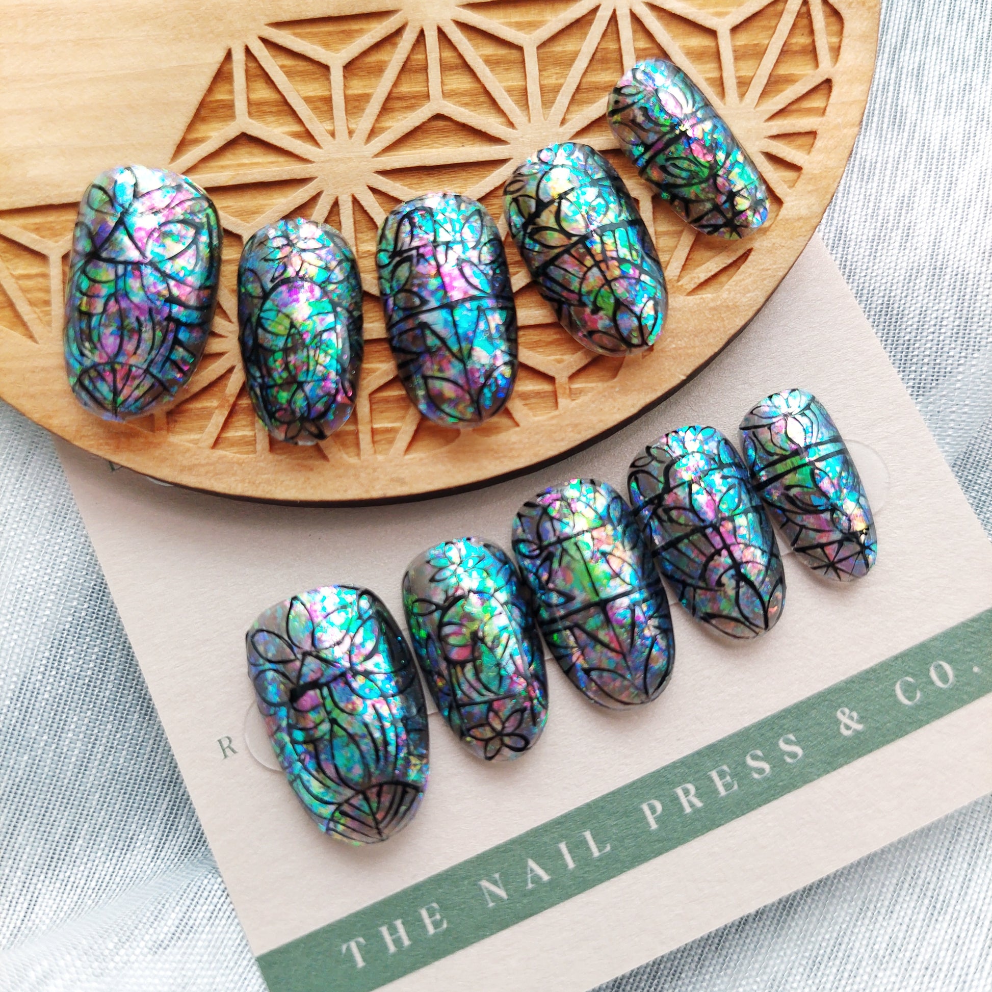 Vibrant, intricate patterns inspired by stained glass meet a classic design in Stained Glass Window. Jewel-toned hues and geometric details create a bold, artistic statement perfect for any occasion. Medium rounded shape offers a timeless, versatile look. Handmade, reusable, and salon-quality for nails that make a statement while staying easy to wear.