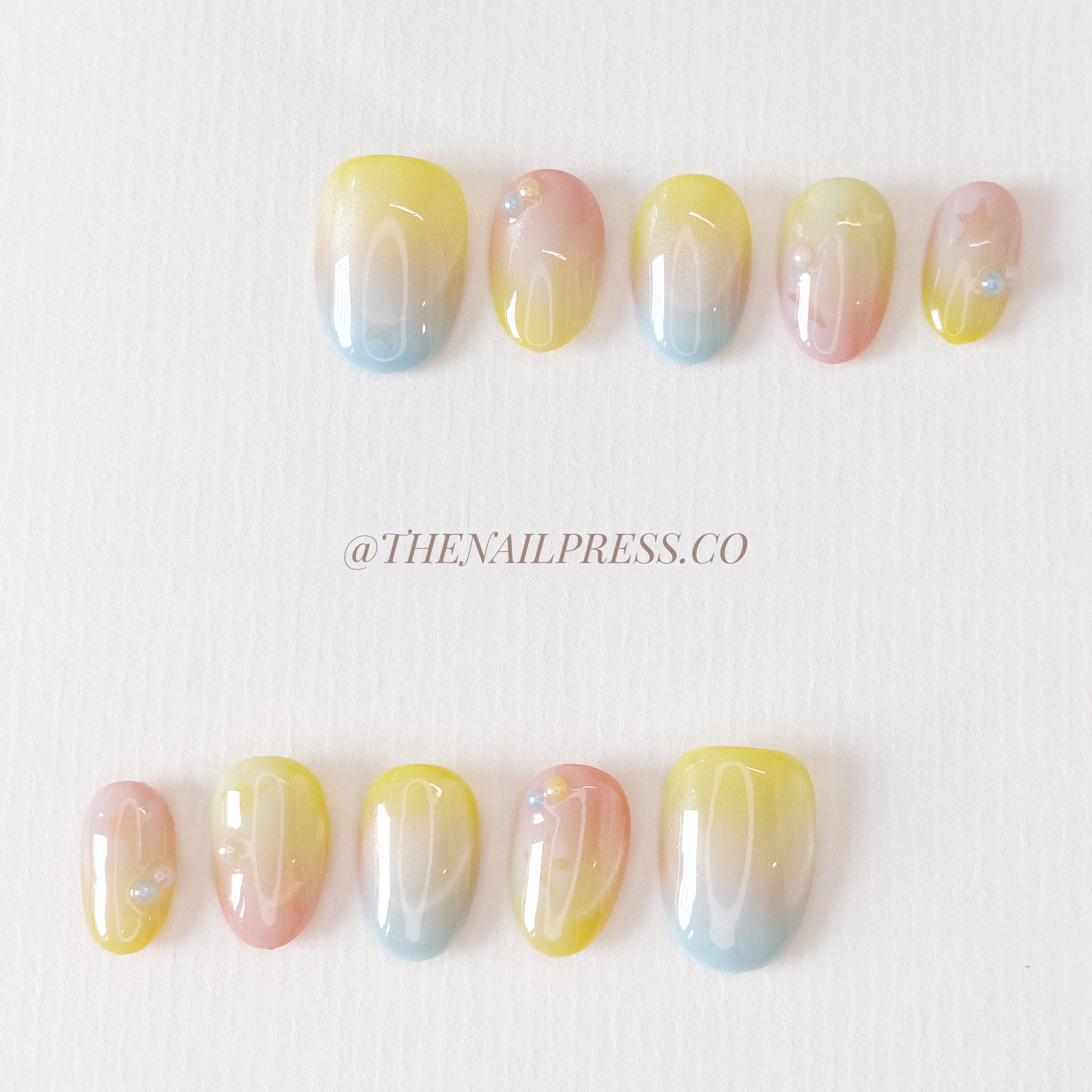 A playful blend of pink, yellow, and blue with a captivating cat-eye effect and subtle hidden stars brings fun and vibrancy to Starburst Swirl. The short rounded shape gives a comfy, charming finish perfect for everyday wear. These handmade press-on nails are reusable and provide a salon-quality finish with effortless application.