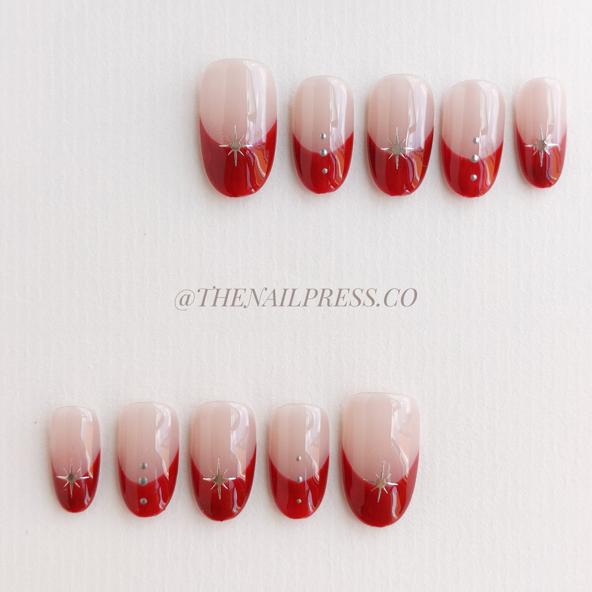 Ignite your look with Starfire Red. Vivid red French tips are accented with shimmering silver stars for a playful yet elegant statement. Medium rounded shape provides a classic, flattering silhouette. Handmade, reusable, and salon-quality for vibrant, easy-to-wear nails.