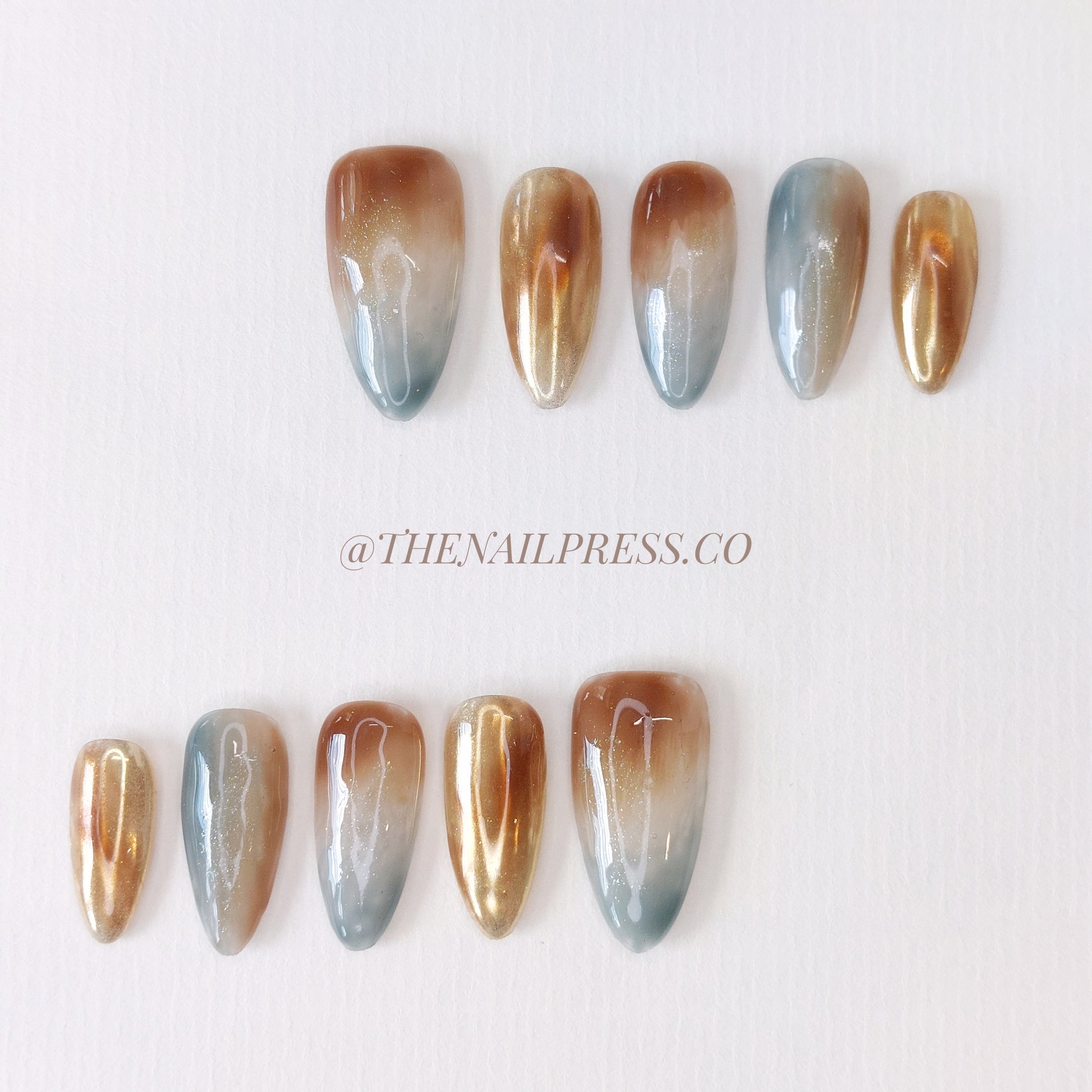 A smooth gradient with marble-like swirls accented by shimmering gold evokes the warm glow of twilight in Sunset Marble. The medium almond shape adds elegance and grace, perfect for making a subtle yet striking statement. These handmade press-on nails are reusable and offer a salon-quality finish for effortless beauty.