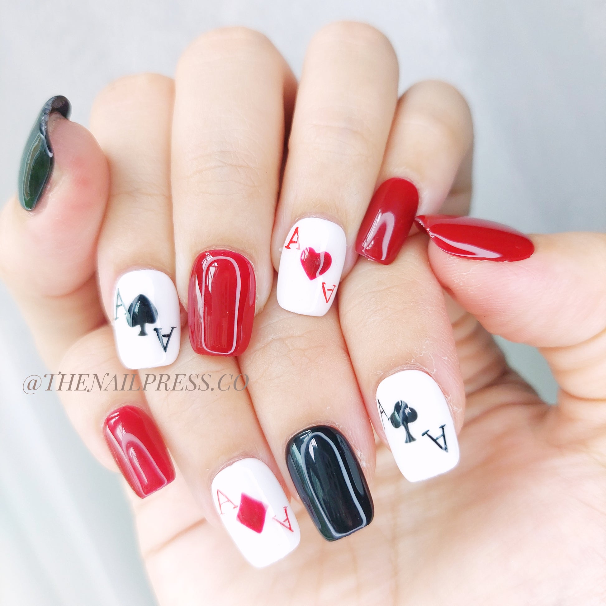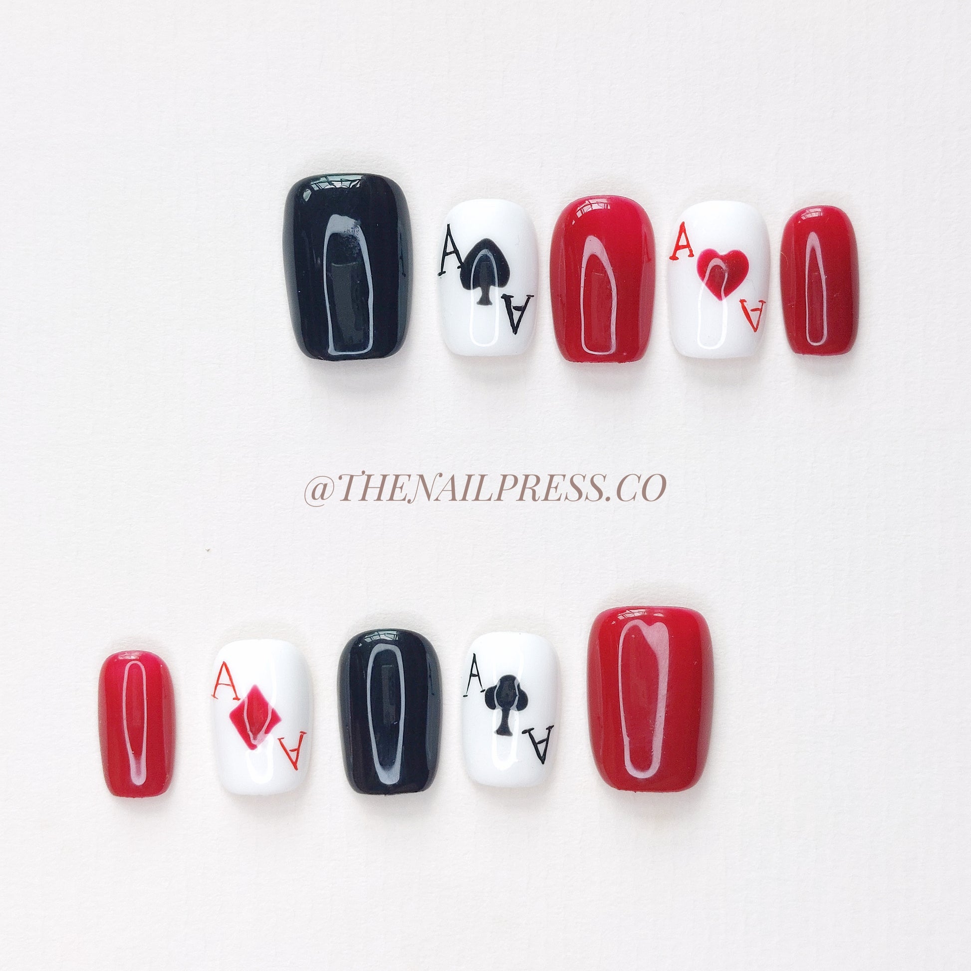 Bring bold, confident style to your nails with The Winning Ace. This striking black and red design blends the elegance of poker cards with a modern twist, creating a daring and stylish look. The short square shape adds a sleek edge, making it perfect for those who love statement nails. Handcrafted and reusable, these nails offer a salon-quality finish for effortlessly polished style.