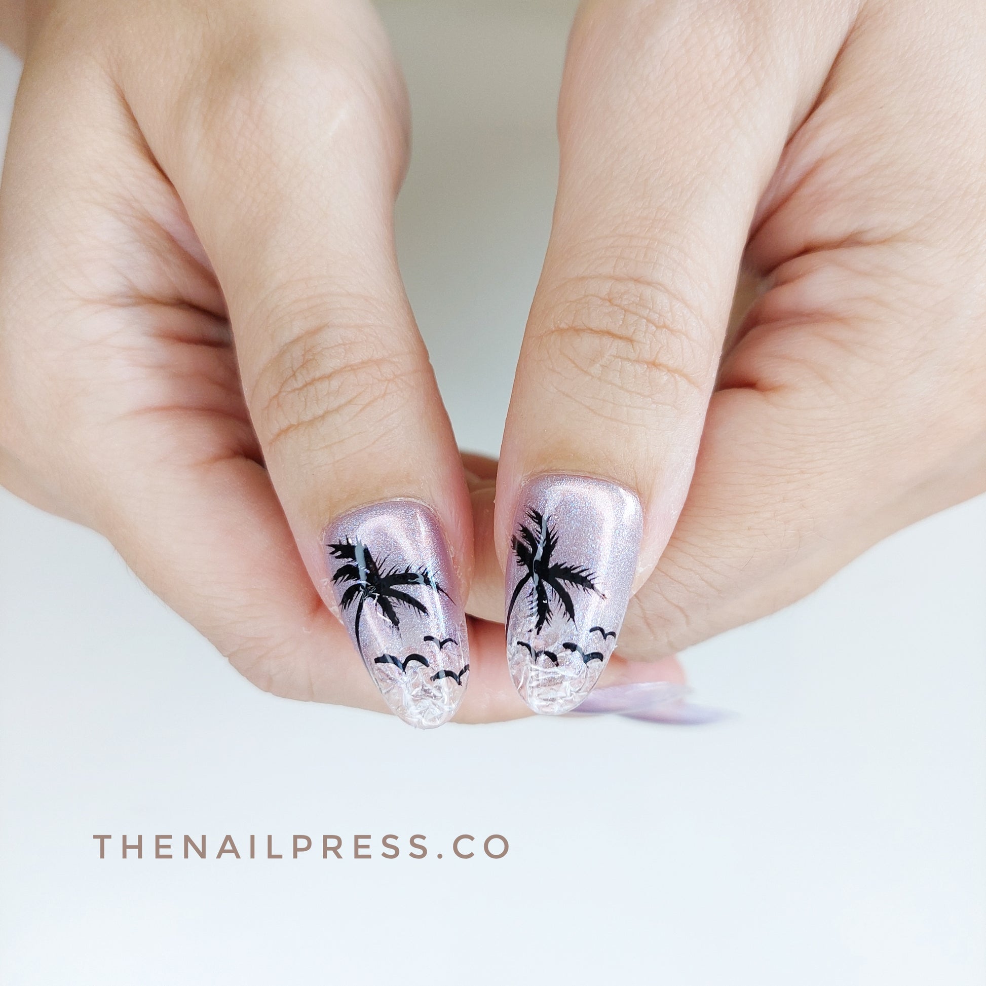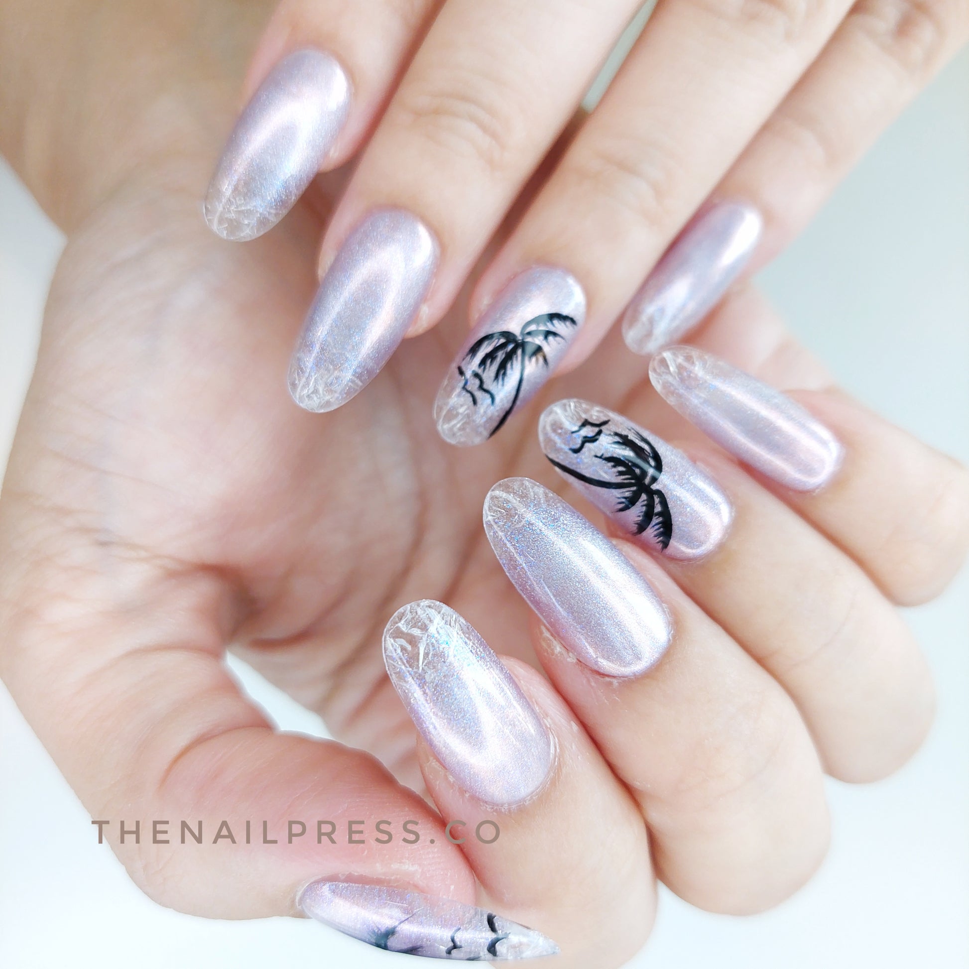 Purple cat-eye nails with transparent tips and a crushed ice effect meet tropical coconut tree silhouettes in Twilight Tropics. The medium oval shape enhances its sleek, exotic appeal. Handmade, reusable, and salon-quality for effortless, vacation-ready elegance.