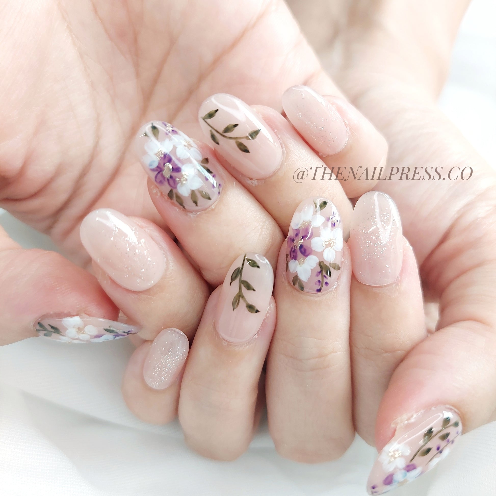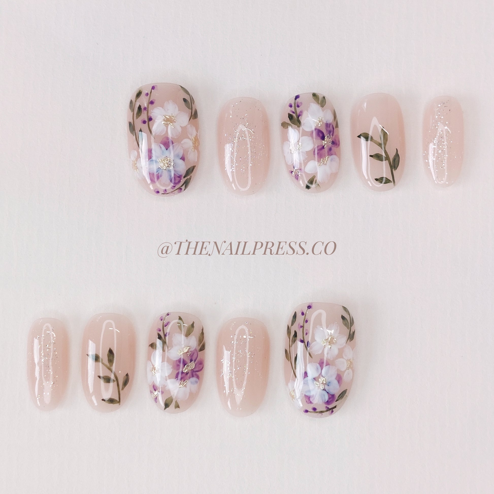 Delight in the soft elegance of Violet Breeze, featuring dainty purple and white florals over a nude base. The medium oval rounded shape enhances its graceful, feminine look. These handmade press-on nails are reusable and provide a salon-quality finish for effortless beauty.