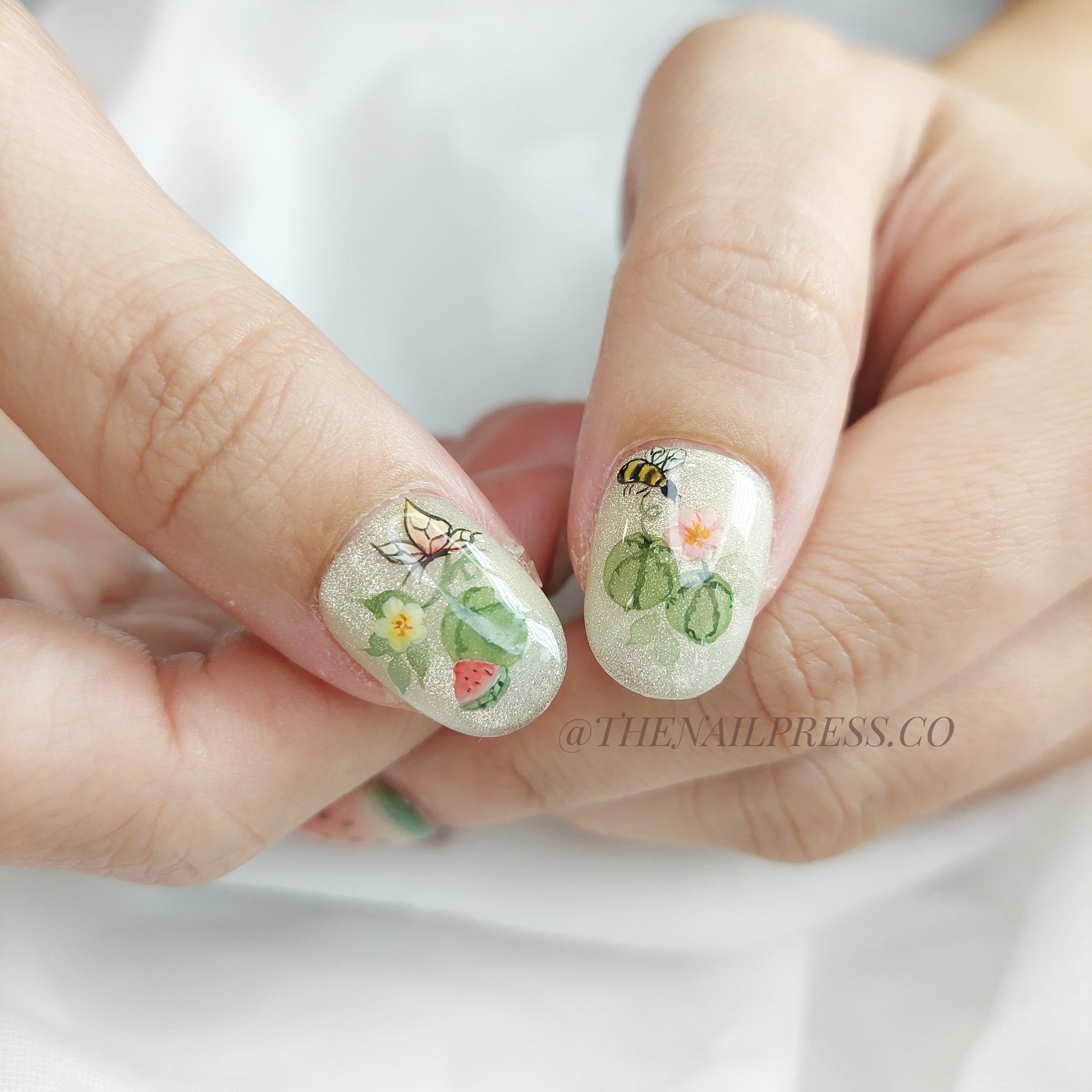 Dive into sweet summer vibes with Watermelon Glitz, featuring hand-painted watermelon slices on a sparkly green base. The short rounded shape adds a cute, easygoing charm, perfect for sunny days and playful moments. These handmade press-on nails are reusable and provide a salon-quality finish for effortless beauty.