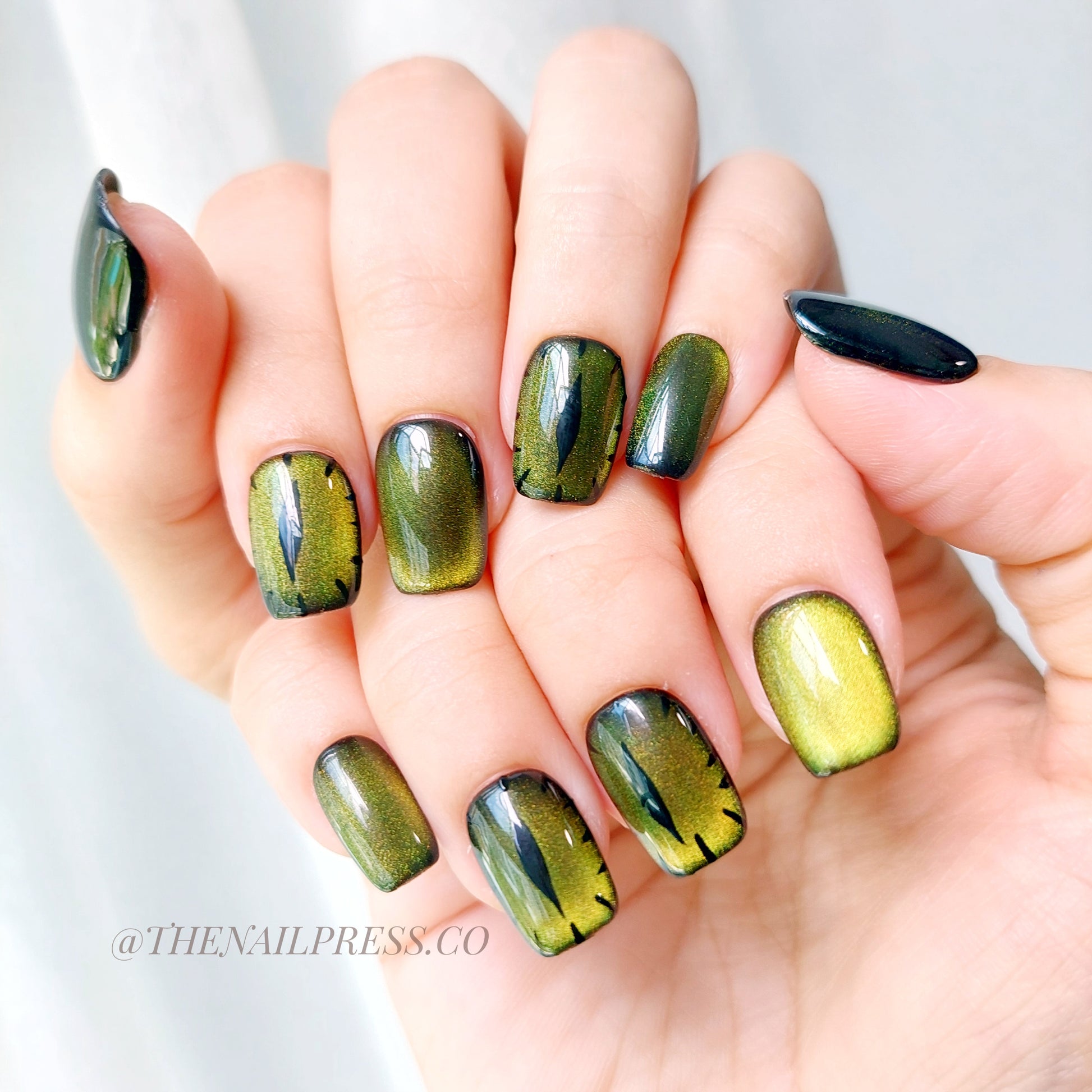 Enter a world of enchantment with Witch's Cat Gaze. Vivid green and yellow cat-eye tones on a sleek black background create a mysterious, magical look. Short square shape offers a modern, edgy silhouette. Handmade, reusable, and salon-quality for nails that are striking, easy to wear, and full of charm.